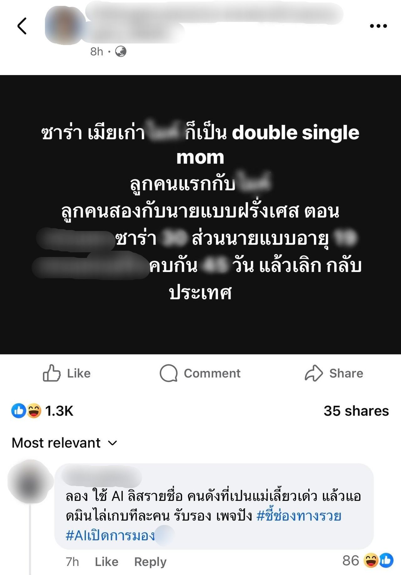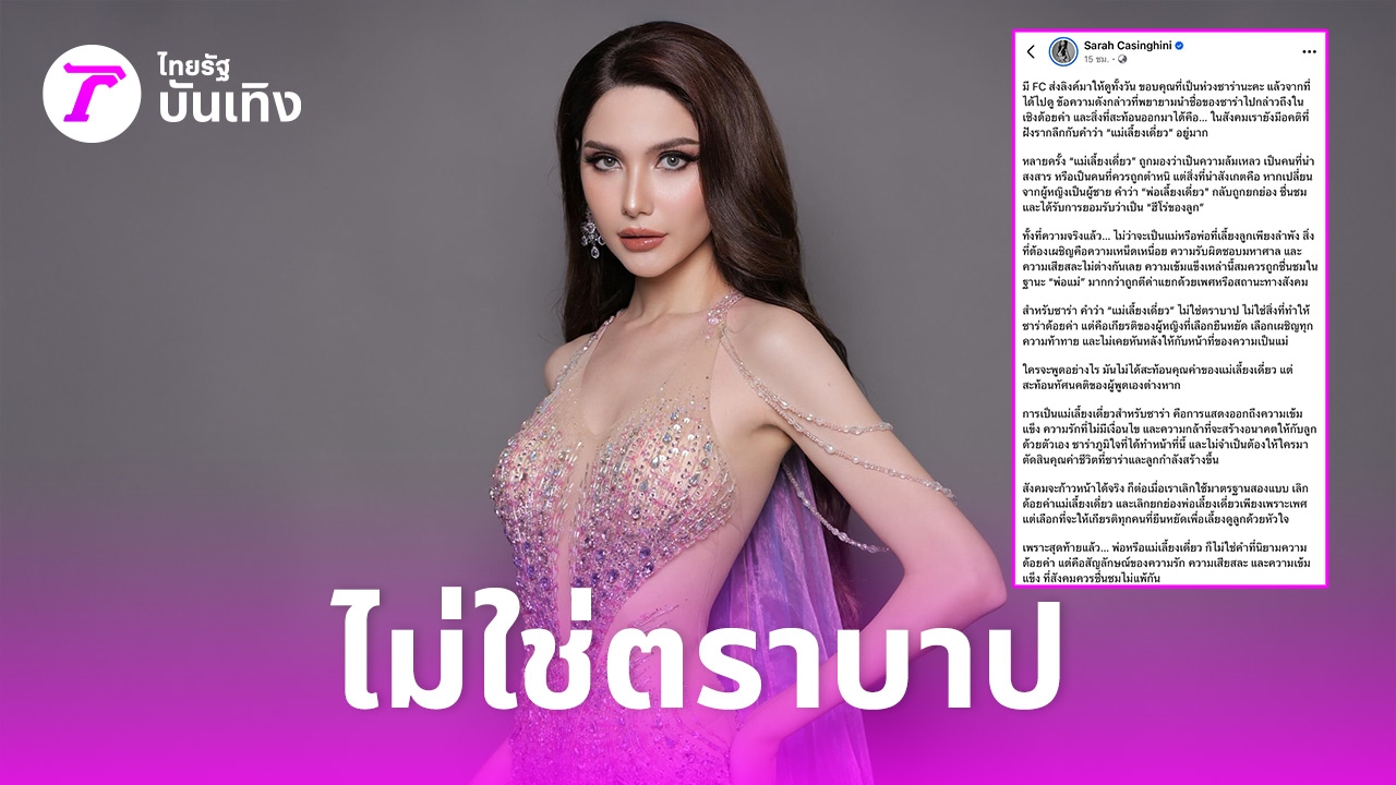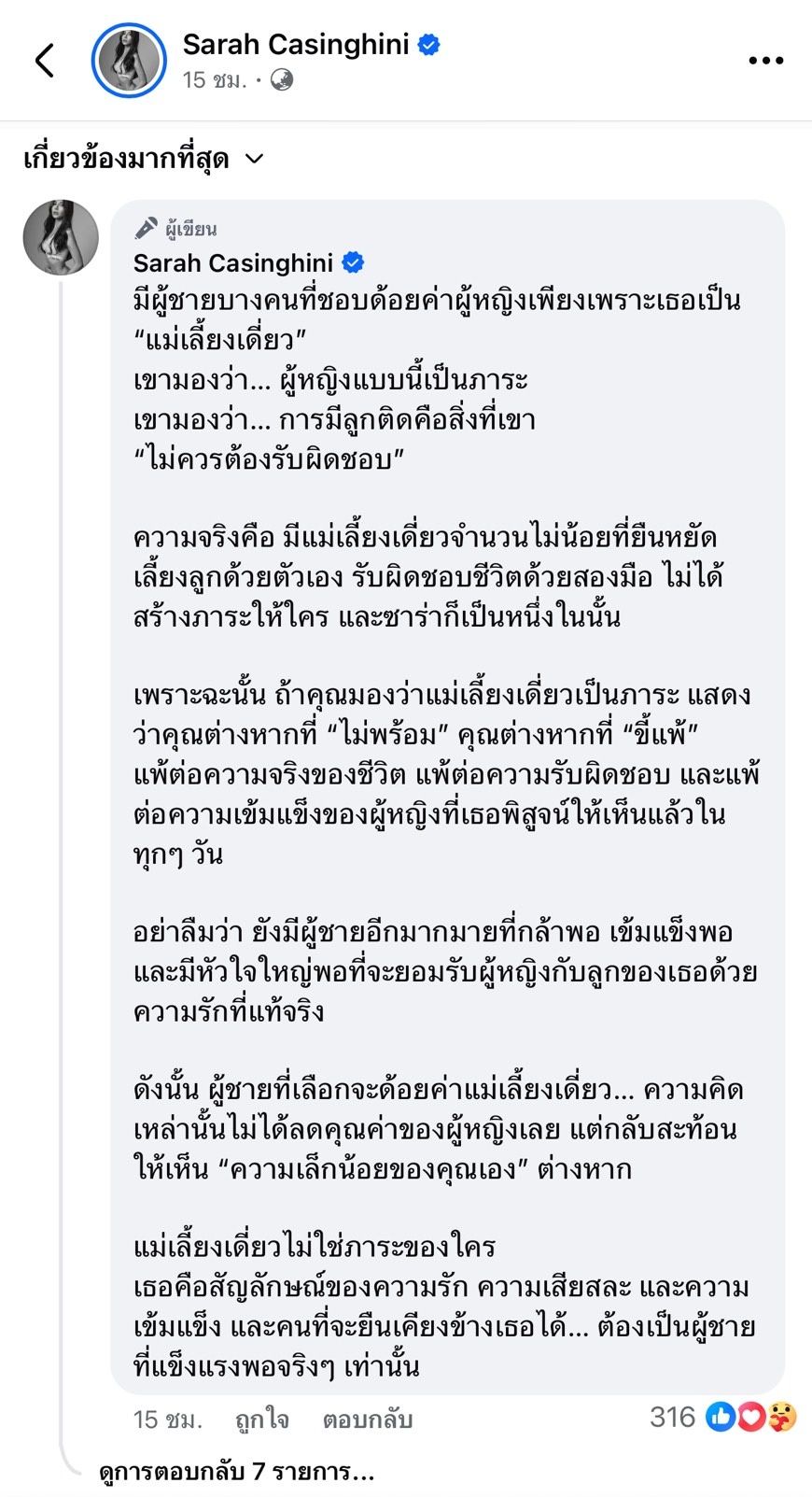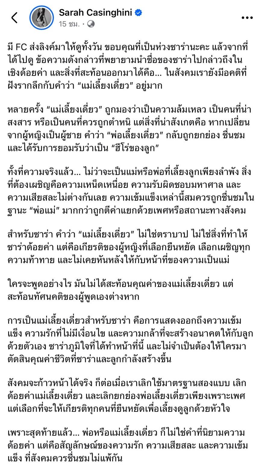“มี FC ส่งลิงก์มาให้ดูทั้งวัน ขอบคุณที่เป็นห่วงซาร่านะคะ แล้วจากที่ได้ไปดู ข้อความดังกล่าวที่พยายามนำชื่อของซาร่าไปกล่าวถึงในเชิงด้อยค่า และสิ่งที่สะท้อนออกมาได้คือ… ในสังคมเรายังมีอคติที่ฝังรากลึกกับคำว่า “แม่เลี้ยงเดี่ยว” อยู่มาก