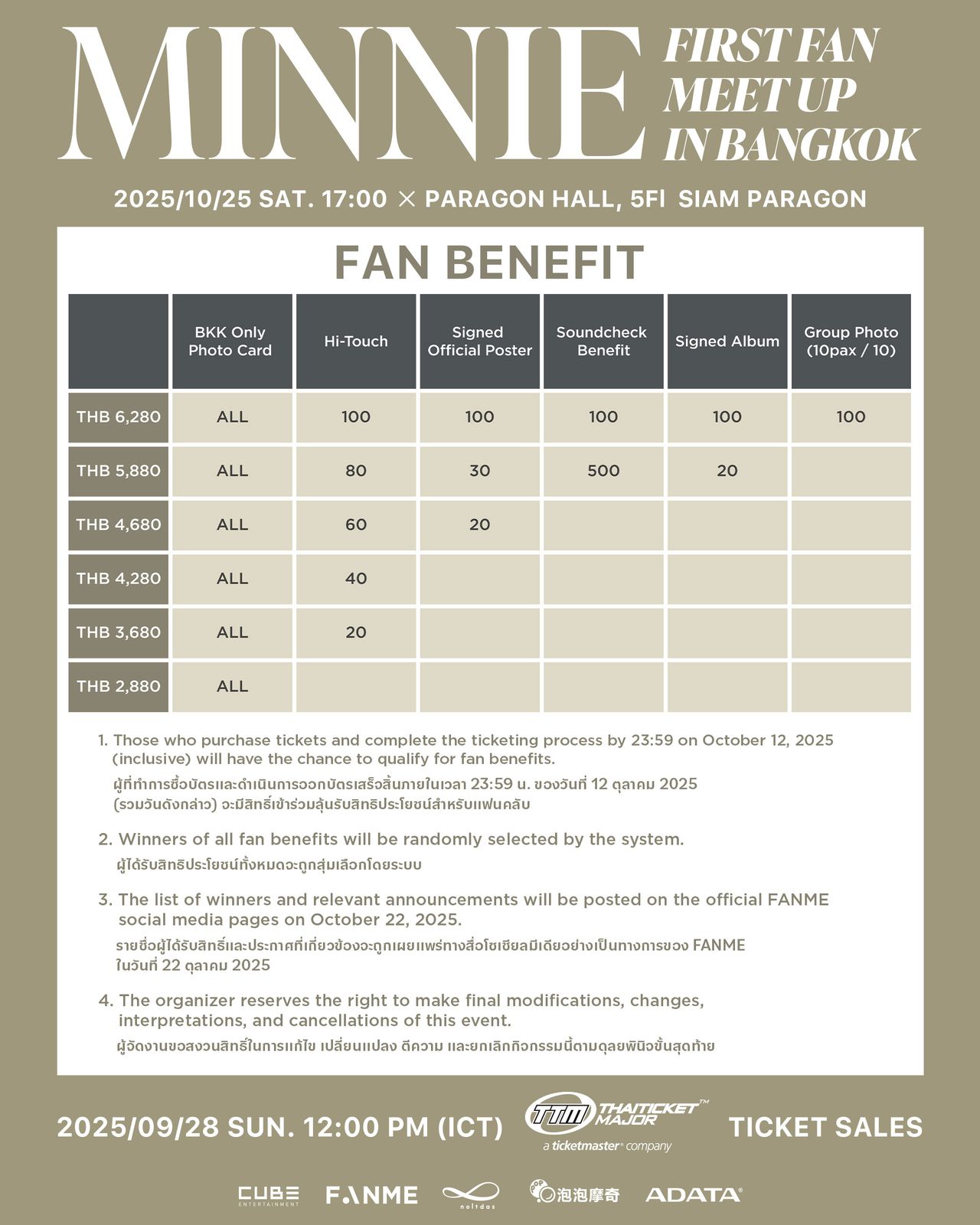 งานนี้เปิดจำหน่ายบัตรวันอาทิตย์ที่ 28 กันยายน 2568 เวลา 12.00 น. เป็นต้นไป ทางเว็บไซต์ .thaiticketmajor ราคาบัตร 6,280 / 5,880 / 4,680 / 4,280 / 3,680 และ 2,880 บาท ลุ้นรับเบเนฟิต อาทิ Thailand Exclusive Photo Card , Hi-Touch , Signed Poster , Soundcheck , Signed Album และ Group Photo