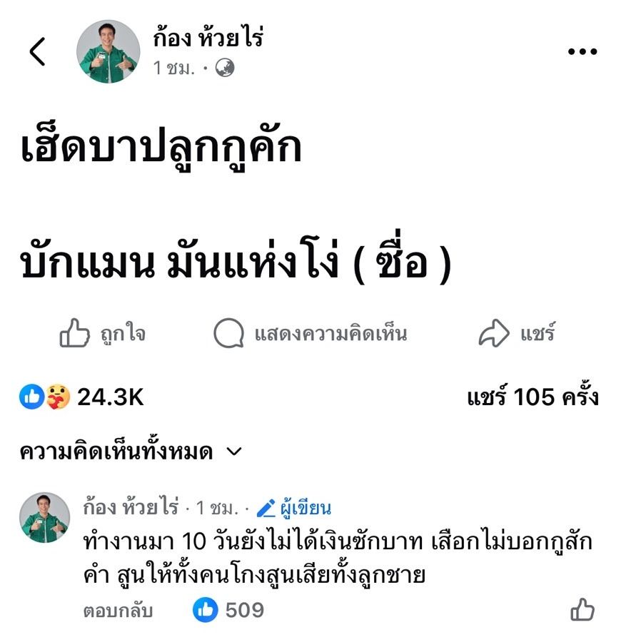 และยังบอกอีกว่า "ทำงานมา 10 วันยังไม่ได้เงินซักบาท เ_ือกไม่บอกกูสักคำ สูนให้ทั้งคนโกงสูนเสียทั้งลูกชาย"