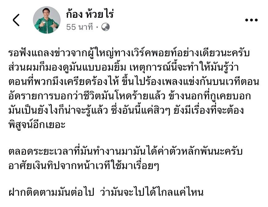 "รอฟังแถลงข่าวจากผู้ใหญ่ทางเวิร์กพอยท์อย่างเดียวนะครับ ส่วนผมก็มองดูมันแบบอมยิ้ม เหตุการณ์นี้จะทำให้มันรู้ว่า ตอนที่พวกมึงเครียดร้องไห้ ขึ้นไปร้องเพลงแข่งกันบนเวทีตอนอัดรายการบอกว่าชีวิตมันโหดร้ายแล้ว ข้างนอกที่กูเคยบอกมันเป็นยังไงก็น่าจะรู้แล้ว ซึ่งอันนี้แค่สิวๆ ยังมีเรื่องที่จะต้องพิสูจน์อีกเยอะ