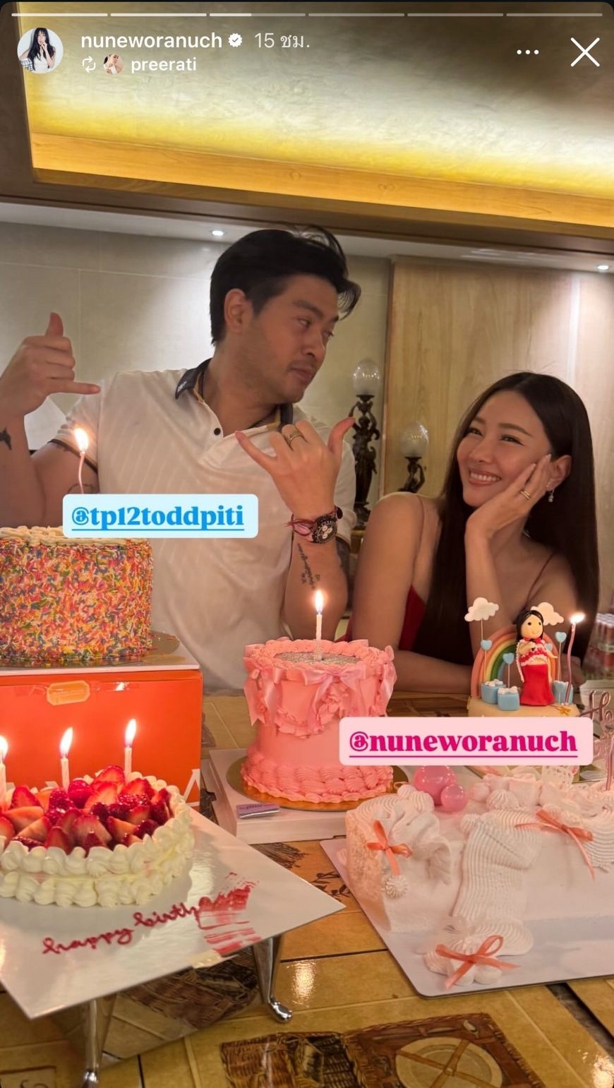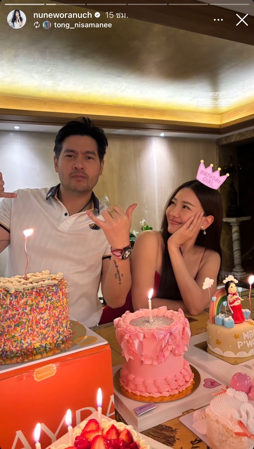 โดยในอินสตาแกรม @tp12toddpiti ของ ต๊อด ปิติ ภิรมย์ภักดี สามีของนุ่น โพสต์ภาพนุ่นกับแมวสุดน่ารักและเขียนข้อความว่า “Happy birthday krubb Nuneee” ก่อนจะโพสต์ภาพหมู่ฉลองวันเกิดของนุ่นที่จัดกันแบบเรียบง่ายในครอบครัว พร้อมทั้งเขียนข้อความว่า “2 4 . 0 9 . 2 5 6 8”