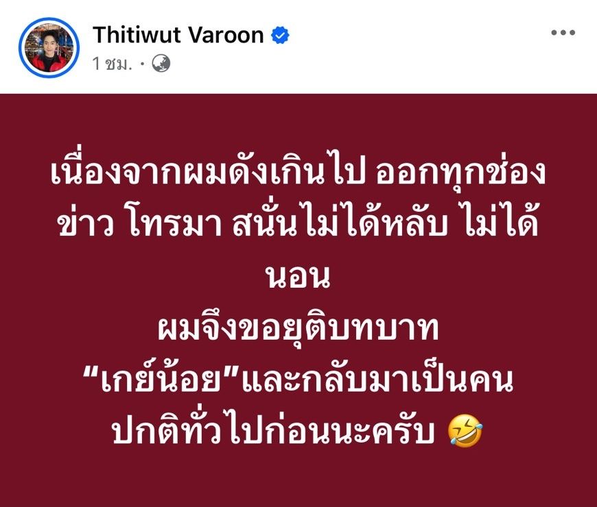 "เนื่องจากผมดังเกินไป ออกทุกช่อง ข่าว โทรมา สนั่นไม่ได้หลับ ไม่ได้นอน ผมจึงขอยุติบทบาท “เกย์น้อย” และกลับมาเป็นคนปกติทั่วไปก่อนนะครับ"
