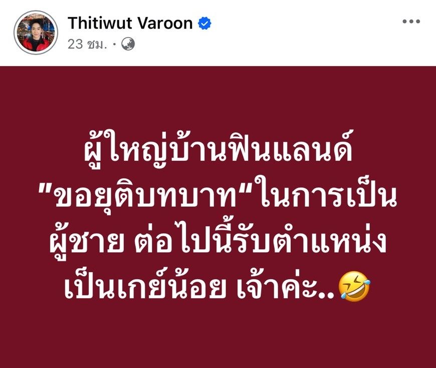 "ผู้ใหญ่บ้านฟินแลนด์ ”ขอยุติบทบาท“ในการเป็นผู้ชาย ต่อไปนี้รับตำแหน่งเป็นเกย์น้อย เจ้าค่ะ.."
