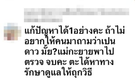 - งานนี้เลยมีชาวเน็ตรายหนึ่ง เข้ามาคอมเมนต์ชี้แนะวิธีแก้ปัญหาให้คนเลิกมาคอมเมนต์ว่าลูกของเธอเป็นดาวน์ซินโดรมคือ "แก้ปัญหาได้ 1 อย่างค่ะ ถ้าไม่อยากให้คนมาถามว่าเป็นดาวมั้ย แม่กะยายพาไปตรวจ จบค่ะ จะได้หาทางรักษาดูแลให้ถูกวิธี"