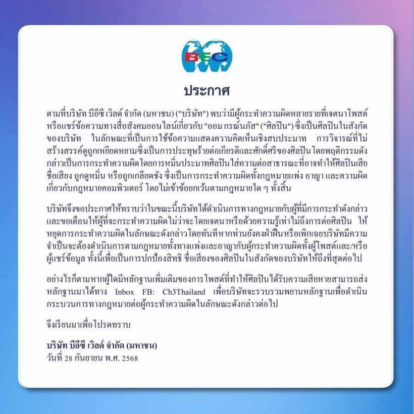 "ตามที่บริษัท บีอีซี เวิลด์ จำกัด (มหาชน) ("บริษัท") พบว่ามีผู้กระทำความผิดหลายรายที่แสดงความคิดเห็นในโพสต์หรือแชร์ข้อความทางสื่อสังคมออนไลน์เกี่ยวกับ "ออม กรณ์นภัส" ("ศิลปิน") ซึ่งเป็นศิลปินในสังกัดของบริษัท ในลักษณะที่เป็นการใช้ข้อความแสดงความเห็นเชิงสาธารณะ การวิจารณ์ที่ไม่สร้างสรรค์ดูถูกเหยียดหยามซึ่งเป็นการประทุษร้ายต่อเกียรติและศักดิ์ศรีของศิลปิน โดยพฤติกรรมดังกล่าวเป็นการกระทำความผิดโดยการหมิ่นประมาทศิลปินใส่ความผู้อื่นด้วยการกระจายหรือทำให้ศิลปินเสียชื่อเสียง ถูกดูหมิ่น หรือถูกเกลียดชัง ซึ่งเป็นการกระทำความผิดทั้งตามกฎหมายแพ่ง อาญา และความผิดเกี่ยวกับกฎหมายคอมพิวเตอร์ โดยไม่ว่าผู้กระทำจำนวนกฎหมายใด ๆ ทั้งสิ้น
