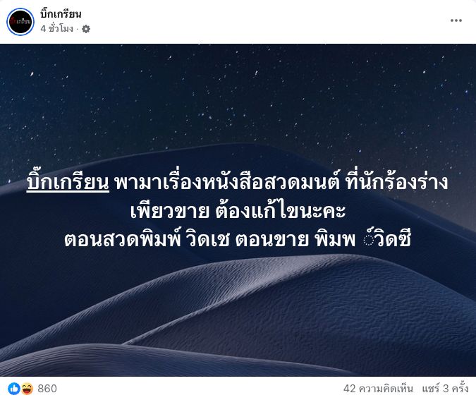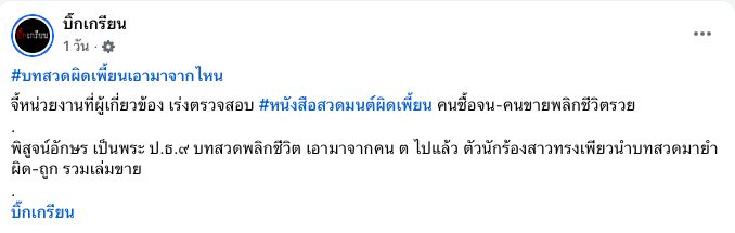 วงการบันเทิงไม่ได้พักอีกแล้ว เพราะล่าสุด เพจบิ๊กเกรียน ได้ออกมาพูดถึงนักร้องทำหนังสือสวดมนต์ขาย โดยมีเนื้อหาว่า "โป๊ะ! นักร้องสาวทรงเพรียว ทำหนังสือสวดมนต์ขายเป็นหมื่นๆ เล่ม มั่วบทสวดผิดเพี้ยน อย่ามารำมวยไทยใส่ บิ๊กเกรียน นะคะ"
