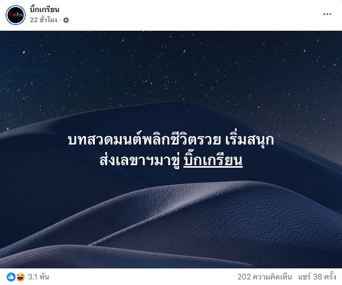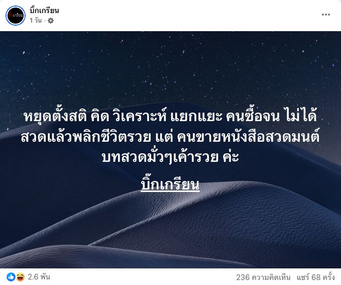 และ "หยุดตั้งสติ คิด วิเคราะห์ แยกแยะ คนซื้อจน ไม่ได้สวดแล้วพลิกชีวิตรวย แต่ คนขายหนังสือสวดมนต์ บทสวดมั่วๆ เค้ารวย ค่ะ บิ๊กเกรียน"