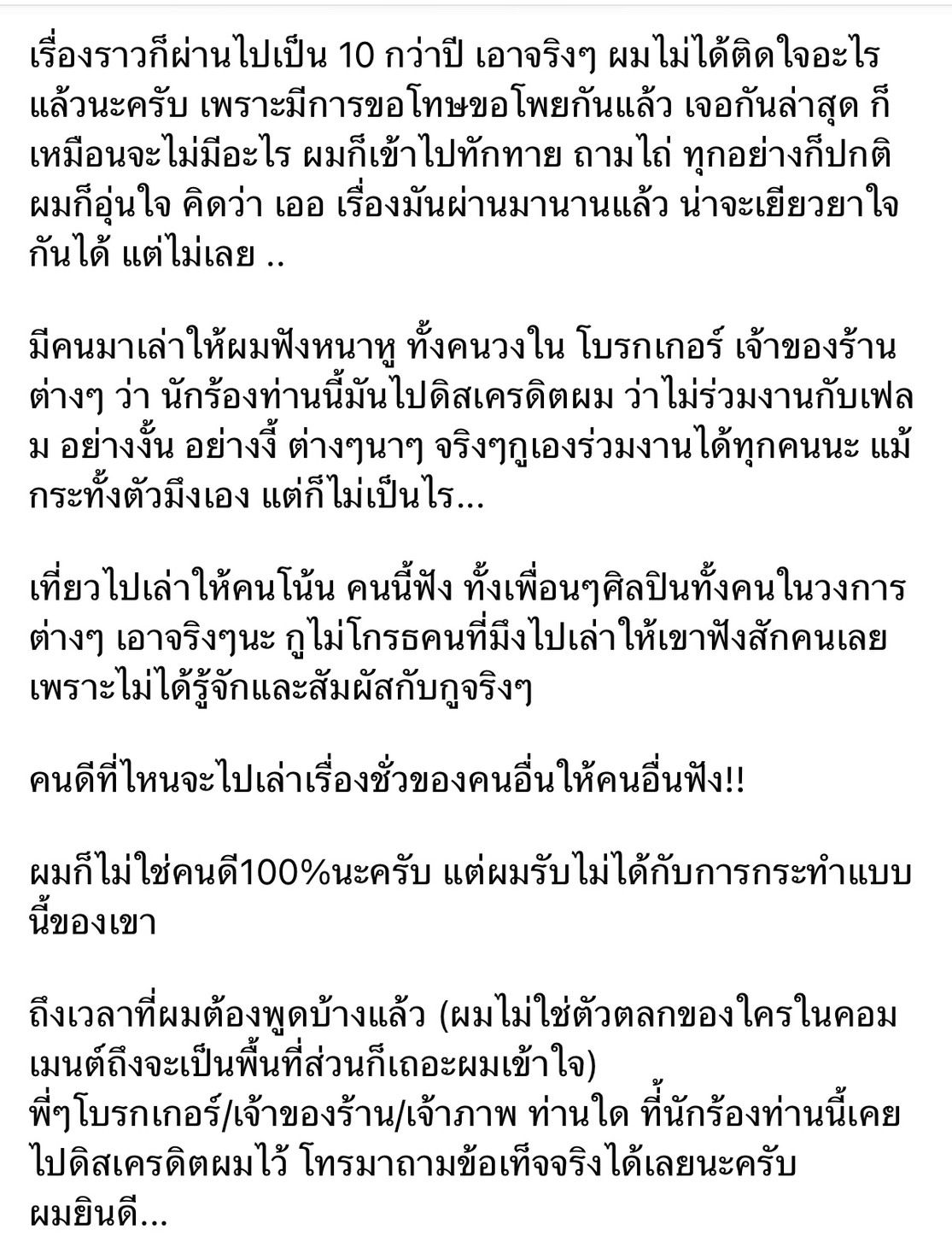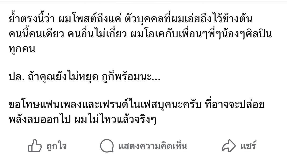 ย้ำตรงนี้ว่า ผมโพสต์ถึงแค่ตัวบุคคลที่ผมเอ่ยถึงไว้ข้างต้นคนนี้คนเดียว คนอื่นไม่เกี่ยว ผมโอเคกับเพื่อนๆ พี่ๆ น้องๆ ศิลปินทุกคน ปล. ถ้าคุณยังไม่หยุด กูก็พร้อมนะ... ขอโทษแฟนเพลงและเฟรนด์ในเฟซบุ๊กนะครับ ที่อาจจะปล่อยพลังลบออกไป ผมไม่ไหวแล้วจริงๆ"