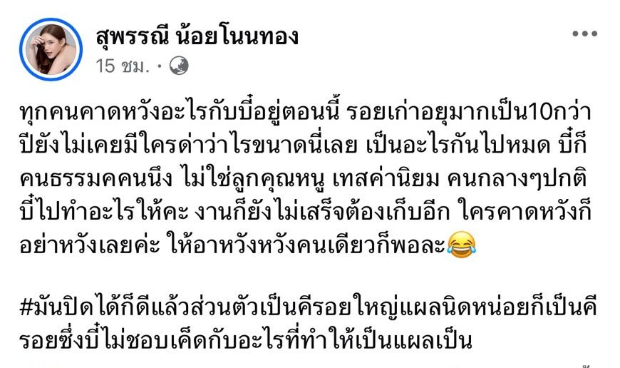 จากนั้นก็ได้โพสต์ว่า "ทุกคนคาดหวังอะไรกับบี๋อยู่ตอนนี้ รอยเก่าอยู่มาเป็น 10 กว่าปียังไม่เคยมีใครด่าว่าอะไรขนาดนี้เลย เป็นอะไรกันไปหมด บี๋ก็คนธรรมดาคนนึง ไม่ใช่ลูกคุณหนู รสนิยมคนกลางๆ ปกติ บี๋ไปทำอะไรให้คะ งานก็ยังไม่เสร็จต้องเก็บอีก ใครคาดหวังก็อย่าหวังเลยค่ะ ให้อาหวังคนเดียวก็พอละ #มันปิดได้ก็ดีแล้วส่วนตัวเป็นคีลอยด์ใหญ่แผลนิดหน่อยก็เป็นคีลอยด์ซึ่งบี๋ไม่ชอบเจ็บกับอะไรที่ทำให้เป็นแผลเป็น"