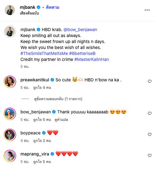ซึ่งแปลความหมายได้ว่า “สุขสันต์วันเกิดครับ @bow_benjawan ขอให้ยิ้มเต็มที่เหมือนเช่นเคย ขอให้รอยยิ้มหวานๆ ของคุณคงอยู่ตลอดทั้งคืนทั้งวัน ขออวยพรให้คุณได้รับพรที่ดีที่สุดเหนือคำอวยพรทั้งหลาย #รอยยิ้มที่ทำให้ฉันละลาย #BbetteriseB เครดิตให้คู่หูของผมด้วยครับ #MasterKalinHan”