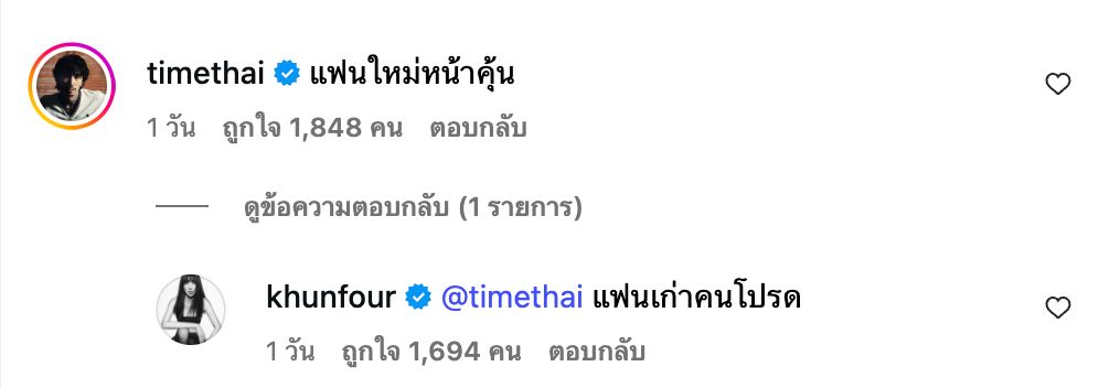 อย่างล่าสุด โฟร์โพสต์รูปลงในอินสตาแกรมทริปที่ไปเที่ยวญี่ปุ่น ธามไท อดีตคนเคยรักกันก็ได้เข้ามาคอมเมนต์ใต้รูปเอาไว้ว่า "แฟนใหม่หน้าคุ้น" งานนี้โฟร์ไม่ปล่อยให้ธามไทแซวอยู่ฝ่ายเดียว คอมเมนต์ตอบกลับว่า "แฟนเก่าคนโปรด" ทำเอาชาวเน็ตกดไลก์และแอบเชียร์ให้คู่นี้เขารีเทิร์นกันอีกรอบ จะลุ้นขึ้นรึเปล่า ต้องมาลุ้นกัน
