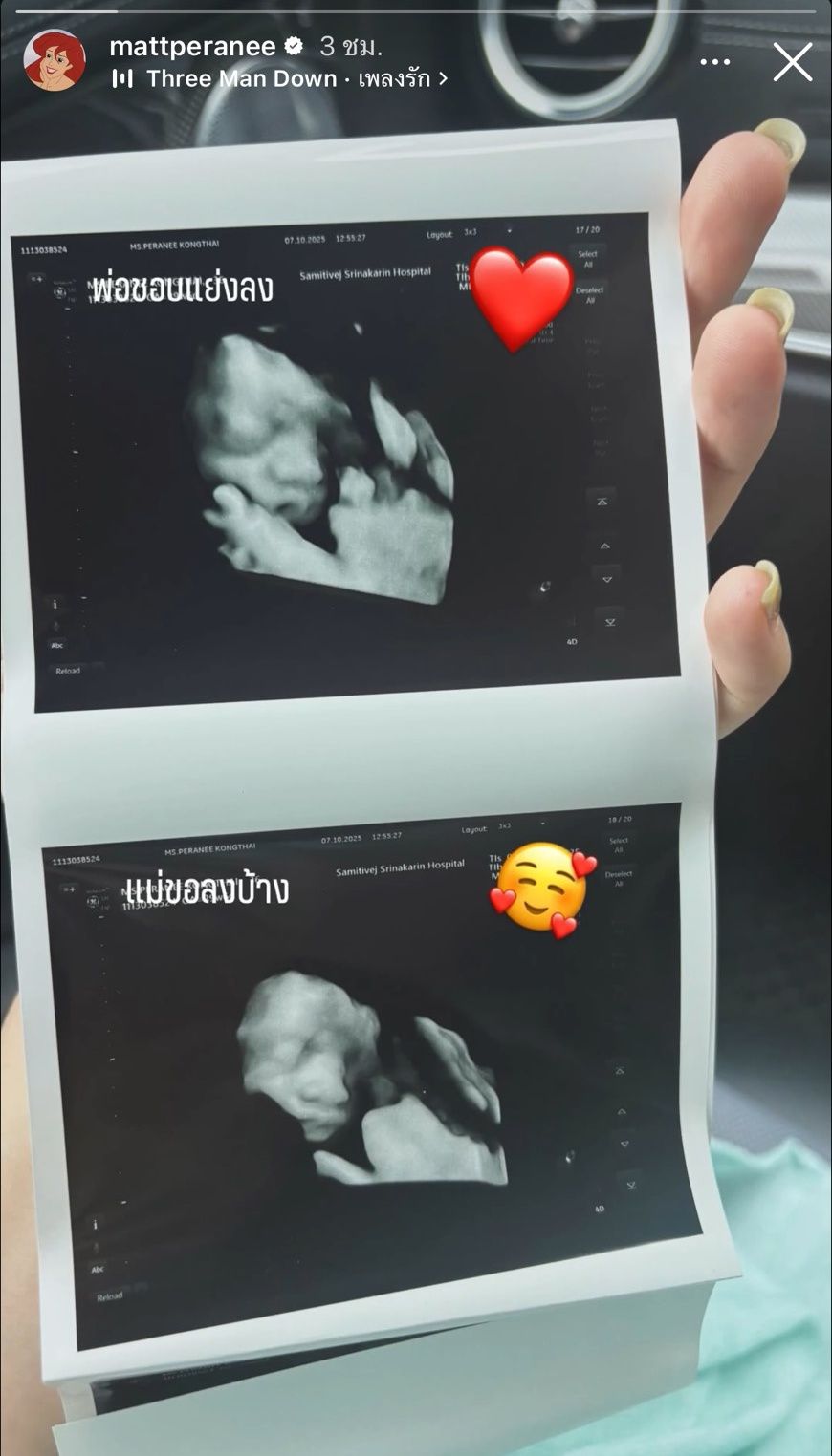 ล่าสุดเผยโมเมนต์น่ารัก แมท ภีรนีย์ และ เฟม ภีมเดช แย่งกันลงรูปอัลตราซาวนด์ลูกชาย โดยแมทลงภาพในไอจีสตอรี่ @mattperanee พร้อมทั้งเขียนข้อความในภาพว่า “พ่อชอบแย่งลง แม่ขอลงบ้าง” และใส่อีโมจิหัวใจกับหน้ายิ้มล้อมรอบด้วยหัวใจ