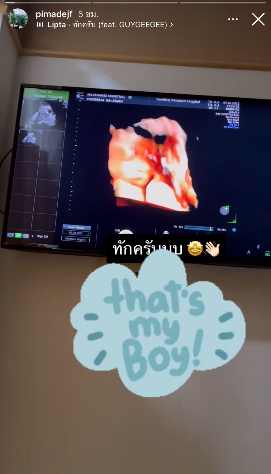 ในขณะที่เฟมก็ลงคลิปอัลตราซาวนด์ลูกชายในไอจีสตอรี่ @pimadejf พร้อมทั้งเขียนข้อความว่า "ทักครับบบ" และติดสติกเกอร์ That's my boy ด้วย