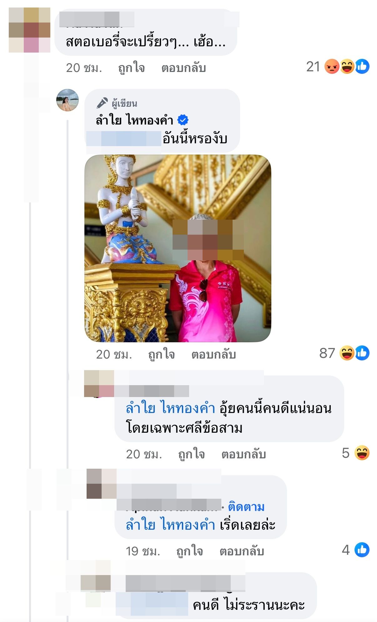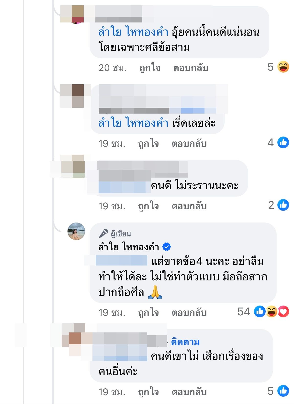 สู้มา สู้กลับไม่โกง ลำไย ฟาดกลับอีกครั้งว่า "แต่ขาดข้อ 4 นะคะ อย่าลืมทำให้ได้ละ ไม่ใช่ทำตัวแบบ มือถือสาก ปากถือศีล" ทำเอาชาวเน็ตเข้ามากดไลก์ และคอมเมนต์เชียร์ให้ลำไยฟ้องชาวเน็ตคนดังกล่าวอีกด้วย