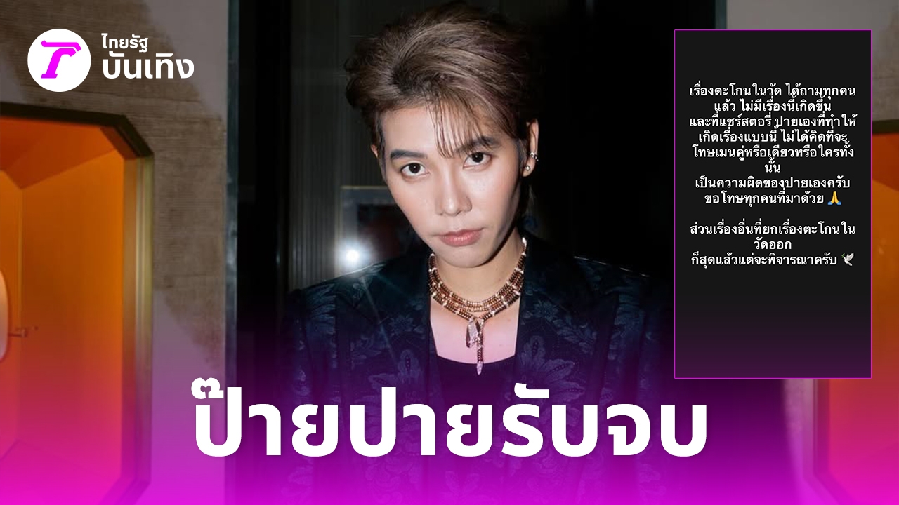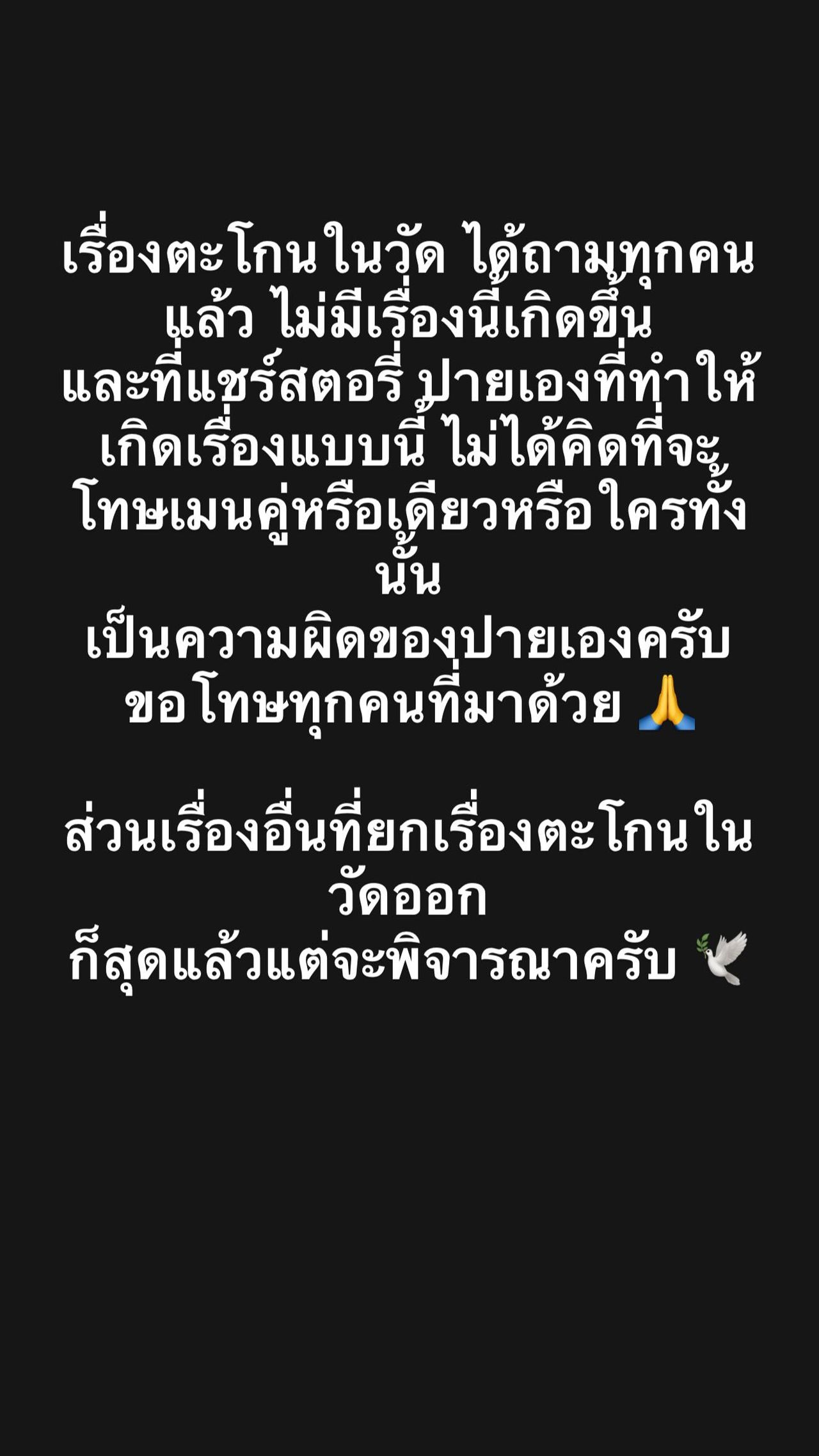 “เรื่องตะโกนในวัด ได้ถามทุกคนแล้ว ไม่มีเรื่องนี้เกิดขึ้น และที่แชร์สตอรี่ ปายเองที่ทำให้เกิดเรื่องแบบนี้ ไม่ได้คิดที่จะโทษเมนคู่หรือเดี่ยวหรือใครทั้งนั้น เป็นความผิดของปายเองครับ ขอโทษทุกคนที่มาด้วย ส่วนเรื่องอื่นที่ยกเรื่องตะโกนในวัดออก ก็สุดแล้วแต่จะพิจารณาครับ”