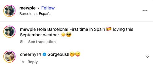 ล่าสุด เชียร์-หมิว บินลัดฟ้าไปทริปเที่ยวประเทศสเปนด้วยกัน ซึ่งในอินสตาแกรมของหมิว @mewpie ได้โพสต์ภาพบรรยากาศที่เมืองบาร์เซโลนา พร้อมทั้งเขียนแคปชั่น “Hola Barcelona! First time in Spain (ธงชาติสเปน) loving this September weather”