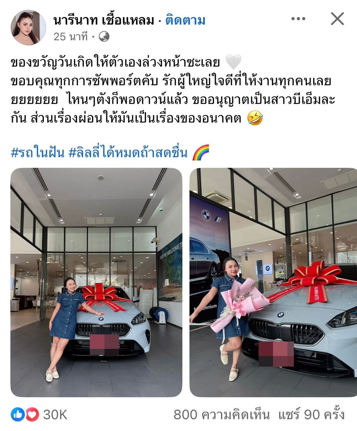 "ของขวัญวันเกิดให้ตัวเองล่วงหน้าซะเลย ขอบคุณทุกการซัพพอร์ตคับ รักผู้ใหญ่ใจดีที่ให้งานทุกคนเลยยยยยยย ไหนๆ ตังค์ก็พอดาวน์แล้ว ขออนุญาตเป็นสาวบีเอ็มละกัน ส่วนเรื่องผ่อนให้มันเป็นเรื่องของอนาคต #รถในฝัน #ลิลลี่ได้หมดถ้าสดชื่น"