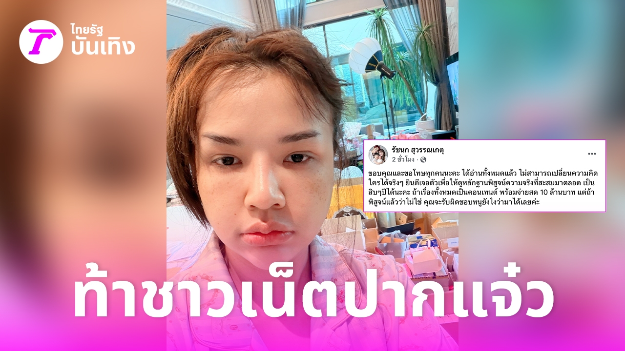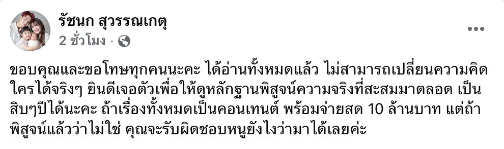 "ขอบคุณและขอโทษทุกคนนะคะ ได้อ่านทั้งหมดแล้ว ไม่สามารถเปลี่ยนความคิดใครได้จริงๆ ยินดีเจอตัวเพื่อให้ดูหลักฐานพิสูจน์ความจริงที่สะสมมาตลอด เป็นสิบๆ ปีได้นะคะ ถ้าเรื่องทั้งหมดเป็นคอนเทนต์ พร้อมจ่ายสด 10 ล้านบาท แต่ถ้าพิสูจน์แล้วว่าไม่ใช่ คุณจะรับผิดชอบหนูยังไงว่ามาได้เลยค่ะ"