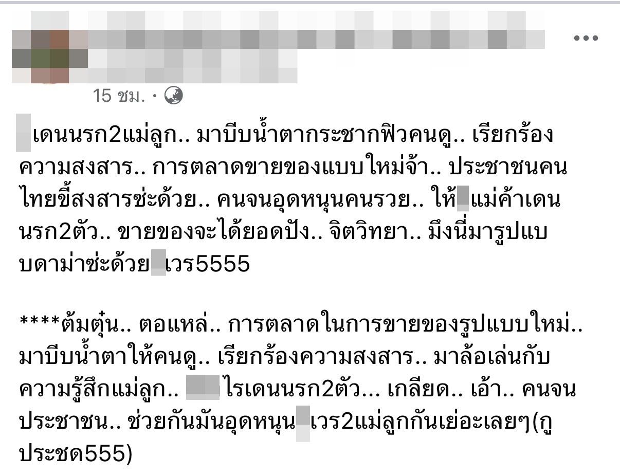 "_เดนนรก 2 แม่ลูก.. มาบีบน้ำตากระชากฟีลคนดู.. เรียกร้องความสงสาร.. การตลาดขายของแบบใหม่จ้า.. ประชาชนคนไทยขี้สงสารซ่ะด้วย.. คนจนอุดหนุนคนรวย.. ให้_แม่ค้าเดนนรก 2 ตัว.. ขายของจะได้ยอดปัง.. จิตวิทยา.. มึงนี่มารูปแบบดราม่าซ่ะด้วย_เวร 5555