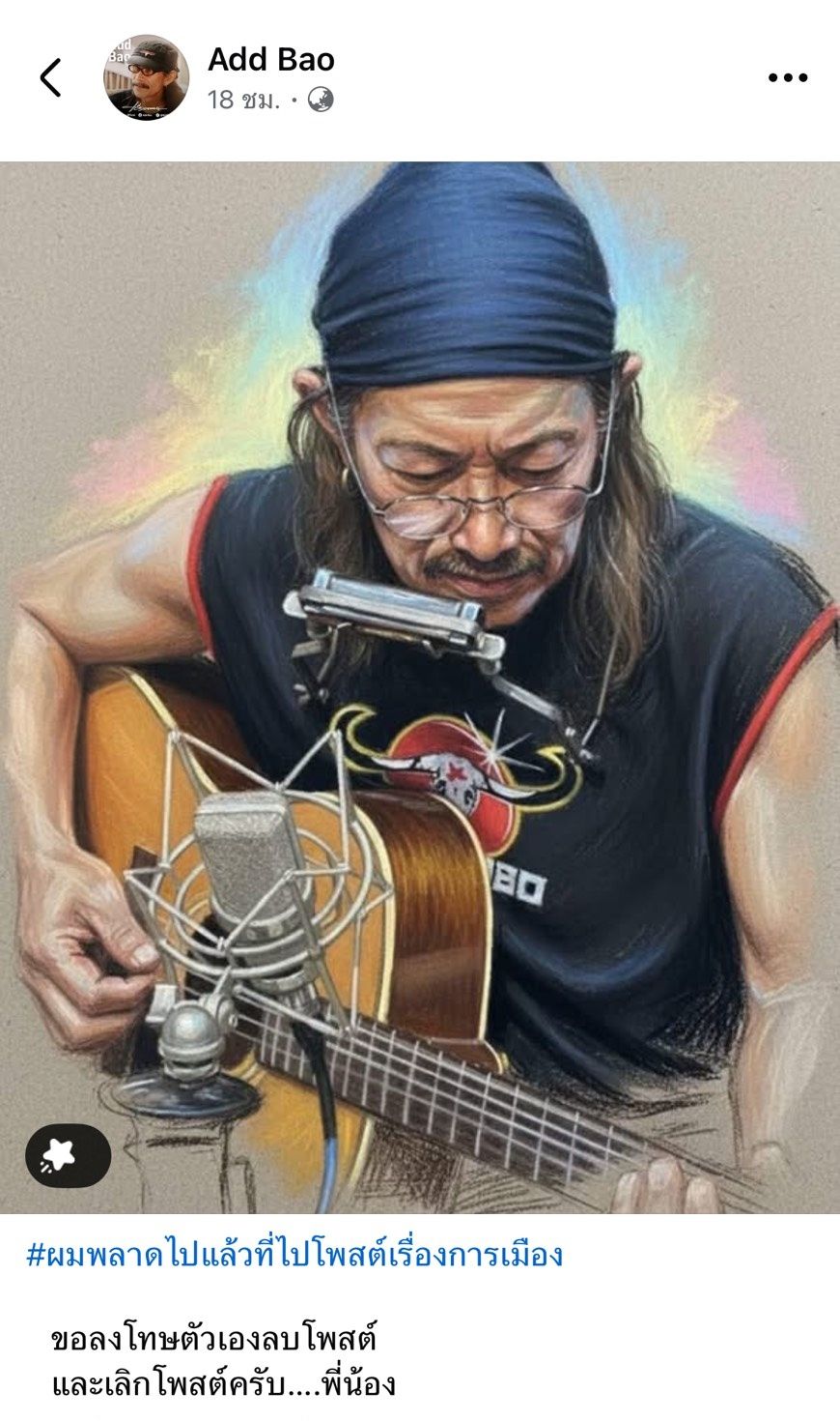 และล่าสุด แอ๊ด คาราบาว ก็ได้โพสต์ข้อความว่า "ผมพลาดไปแล้วที่ไปโพสต์เรื่องการเมือง...ขอลงโทษตัวเอง ลบโพสต์ และเลิกโพสต์ครับ...พี่น้อง"
