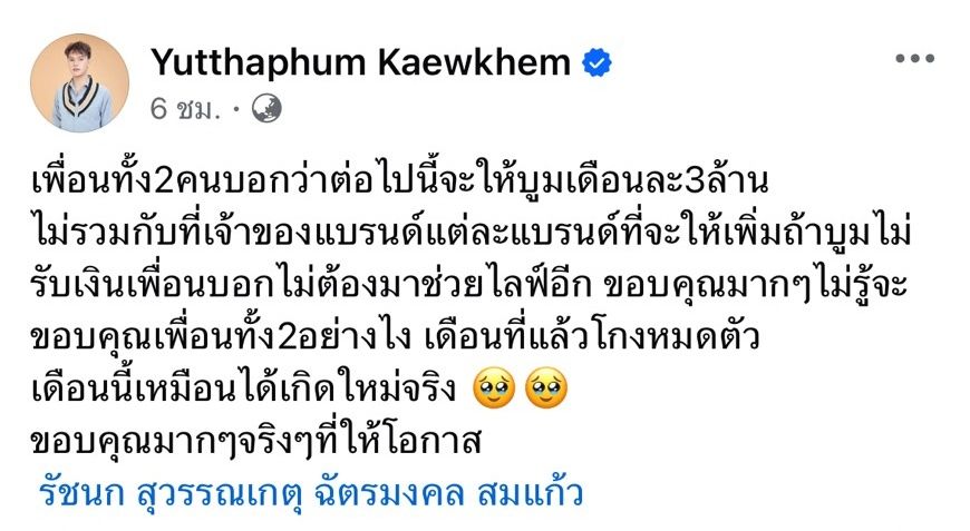 "เพื่อนทั้ง 2 คนบอกว่าต่อไปนี้จะให้บูมเดือนละ 3 ล้าน ไม่รวมกับที่เจ้าของแบรนด์แต่ละแบรนด์ที่จะให้เพิ่ม ถ้าบูมไม่รับเงิน เพื่อนบอกไม่ต้องมาช่วยไลฟ์อีก ขอบคุณมาก ๆ ไม่รู้จะขอบคุณเพื่อนทั้ง 2 อย่างไร เดือนที่แล้วโกงหมดตัว เดือนนี้เหมือนได้เกิดใหม่จริง ขอบคุณมาก ๆ จริง ๆ ที่ให้โอกาส" พร้อมกับติดแท็กไปที่เจนนี่กับยิว