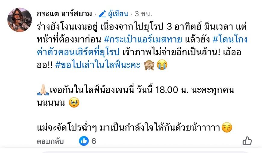ก่อนจะคอมเมนต์เพิ่มเติมว่า “ร่างยังโงนเงนอยู่ เนื่องจากไปยุโรป 3 อาทิตย์ มึนเวลา แต่หน้าที่ต้องมาก่อน #กระเป๋าแอร์เมสหาย แล้วยัง #โดนโกงค่าตัวคอนเสิร์ตที่ยุโรป เจ้าภาพไม่จ่ายอีกเป็นล้าน! เอ้ออออ!! #ขอไปเล่าในไลฟ์นะคะ เจอกันในไลฟ์น้องเจนนี่ วันนี้ 18.00 น. นะคะทุกคนนนนนน แม่จะจัดโปรฉ่ำๆ มาเป็นกำลังใจให้กันด้วยน้าาาาา”