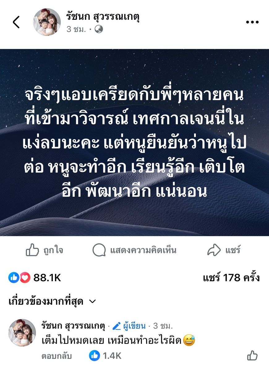 ด้าน เจนนี่ เองก็ได้ออกมาเคลื่อนไหวถึงเรื่องนี้แล้ว โดยบอกว่า "จริงๆ แอบเครียดกับพี่ๆ หลายคนที่เข้ามาวิจารณ์ เทศกาลเจนนี่ในแง่ลบนะคะ แต่หนูยืนยันว่าหนูไปต่อ หนูจะทำอีก เรียนรู้อีก เติบโตอีก พัฒนาอีก แน่นอน" และเขียนเพิ่มอีกว่า "เต็มไปหมดเลย เหมือนทำอะไรผิด"