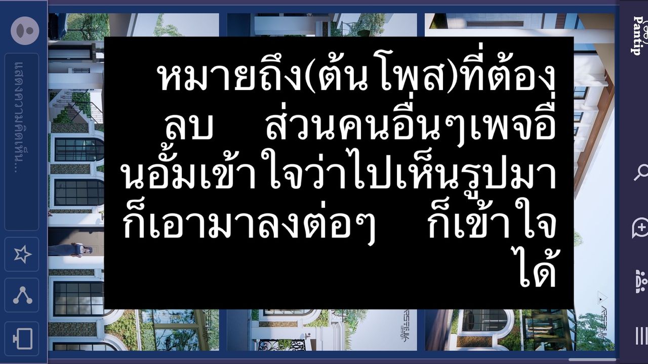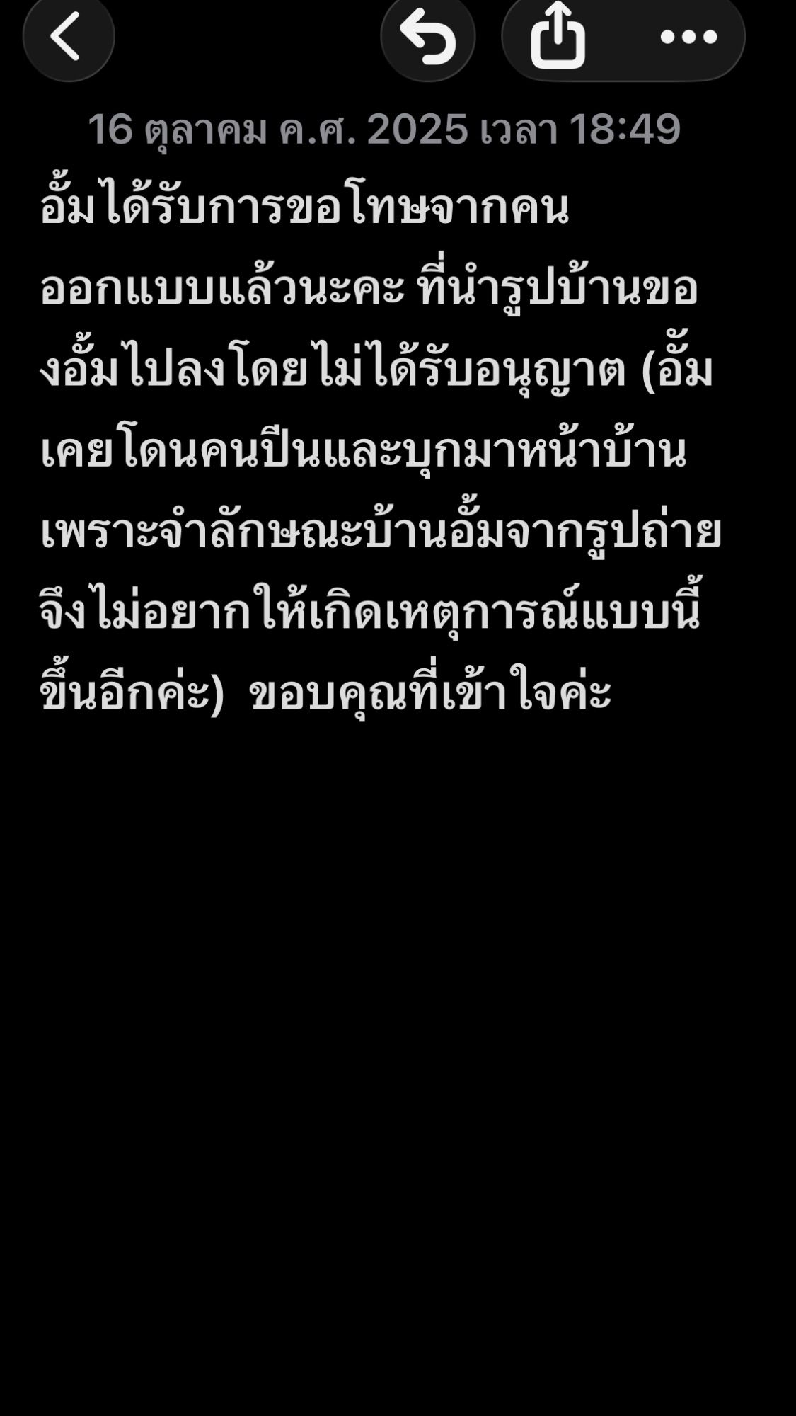 "ไม่โอเค คุณไม่มีสิทธิ์เอารูปบ้านคนอื่นมาลง ช่วยลงขอโทษ และทิ้งโพสต์ขอโทษ 2 อาทิตย์ และลบรูปออกทันทีวันนี้ หมายถึง (ต้นโพสต์) ที่ต้องลบ ส่วนคนอื่นๆ เพจอื่น อั้มเข้าใจว่าไปเห็นรูปมาก็เอามาลงต่อๆ ก็เข้าใจได้" ก่อนที่ต้นโพสต์ดังกล่าวจะลบโพสต์ทิ้งไปแล้ว