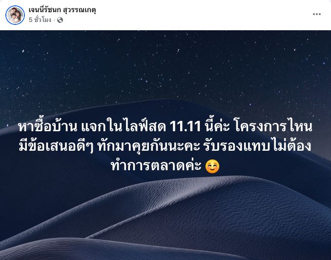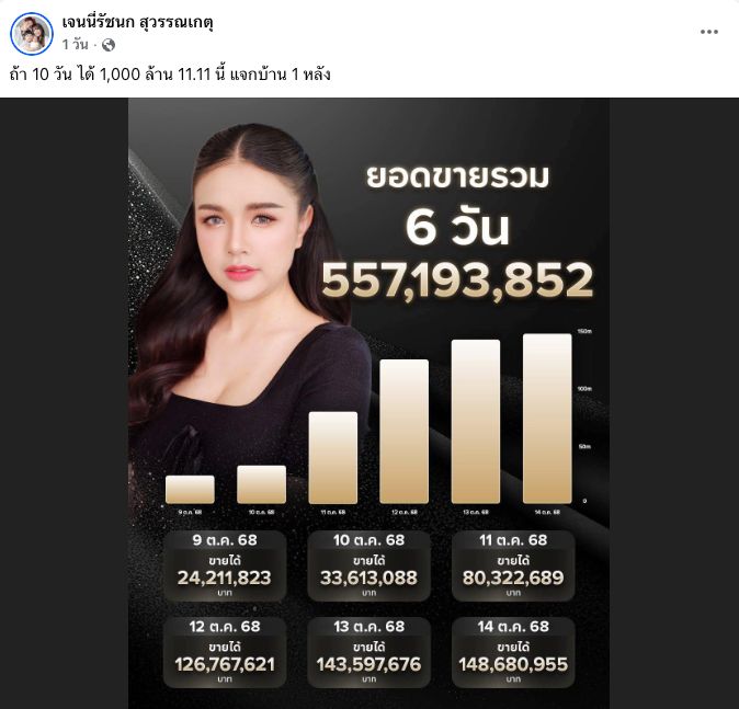 และล่าสุด ความฮอตนี้ทำเอาแฟนๆ ร้องว้าว เมื่อ เจนนี่ ได้หมดถ้าสดชื่น โพสต์แจ้งข่าวดีผ่านทางเฟซบุ๊กของตัวเองว่า "ถ้า 10 วัน ได้ 1,000 ล้าน 11.11 นี้ แจกบ้าน 1 หลัง" ก่อนจะโพสต์ต่อว่า หาซื้อบ้าน แจกในไลฟ์สด 11.11 นี้ค่ะ โครงการไหนมีข้อเสนอดีๆ ทักมาคุยกันนะคะ รับรองแทบไม่ต้องทำการตลาดค่ะ"
