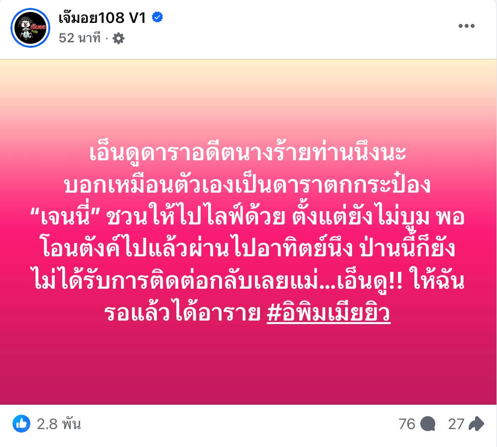 "เอ็นดูดาราอดีตนางร้ายท่านนึงนะ บอกเหมือนตัวเองเป็นดาราตกกระป๋อง เจนนี่ ชวนให้ไปไลฟ์ด้วย ตั้งแต่ยังไม่บูม พอโอนตังค์ไปแล้ว ผ่านไปอาทิตย์นึง ป่านนี้ก็ยังไม่ได้รับการติดต่อกลับเลยแม่…เอ็นดู!! ให้ฉันรอแล้วได้อาราย #อิพิมเมียยิว" และ "นางบอกโอนเงินแล้ว ขอเงินคืนแล้ว แต่ยังไม่ได้คืนนนนนน… ถถถถ"