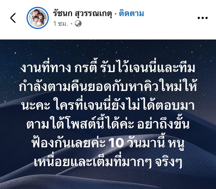จากนั้น เจนนี่ ก็ได้โพสต์ข้อความผ่านทางเฟซบุ๊กว่า "งานที่ทาง กรตี้ รับไว้เจนนี่และทีมกำลังตามคืนยอดกับหาคิวใหม่ให้นะคะ ใครที่เจนนี่ยังไม่ได้ตอบมาตามใต้โพสต์นี้ได้ค่ะ อย่าถึงขั้นฟ้องกันเลยค่ะ 10 วันมานี้ หนูเหนื่อยและเต็มที่มากๆ จริงๆ พี่ๆเลือกได้ 2 ทางนะคะ คือลงคิวใหม่ กับโอนยอดคืนค่ะ ตอบช้าใครไปขออภัยค่ะ ข้อความเป็นหมื่นๆแชทเลยค่ะ ไม่ทันจริงๆ เอเจนซี่ทุกท่านขายงาน +10,000 เท่านั้นนะคะ" และ "กำลังไล่ทักทุกคนนะคะ"