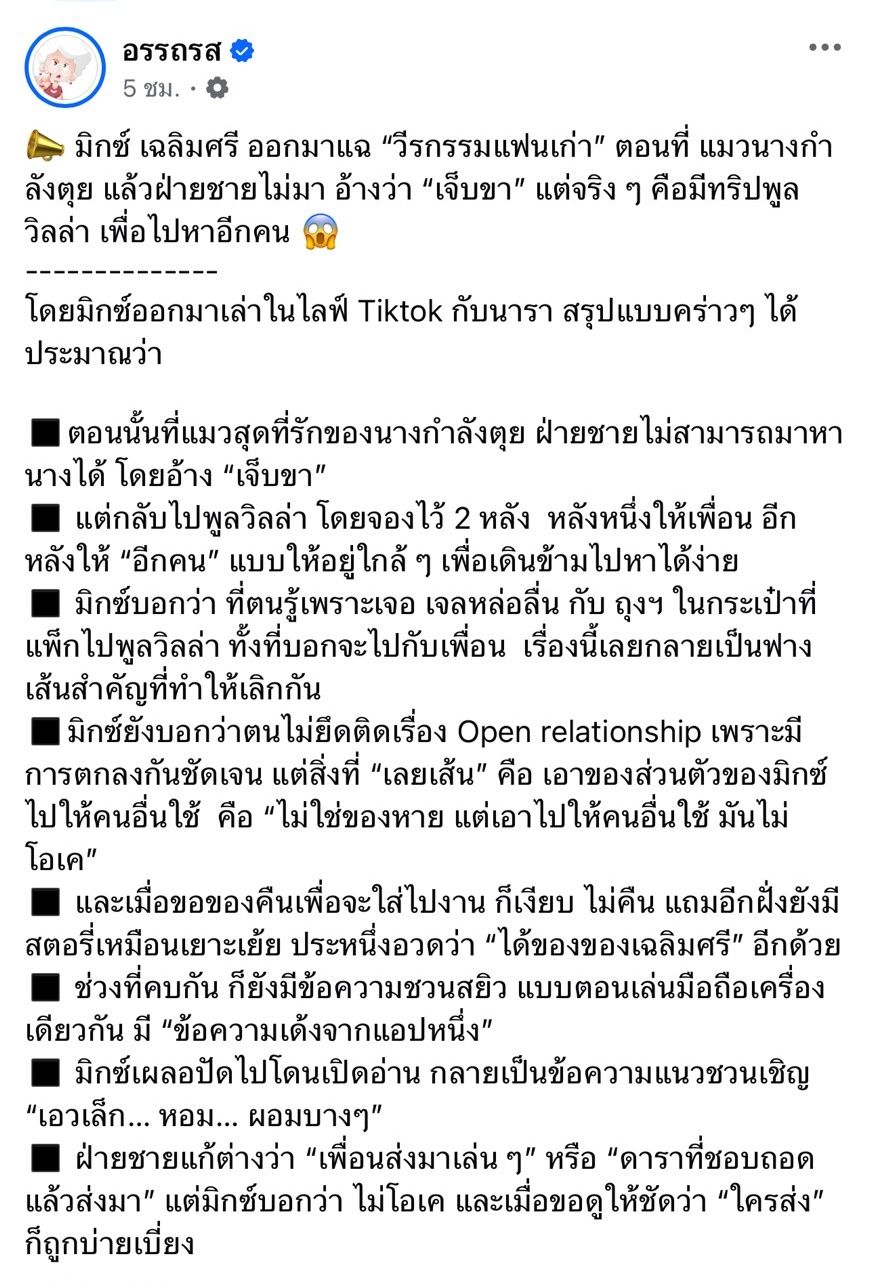 “มิกซ์ เฉลิมศรี ออกมาแฉ “วีรกรรมแฟนเก่า” ตอนที่ แมวนางกำลังตุย แล้วฝ่ายชายไม่มา อ้างว่า “เจ็บขา” แต่จริง ๆ คือมีทริปพูลวิลล่า เพื่อไปหาอีกคน โดยมิกซ์ออกมาเล่าในไลฟ์ Tiktok กับนารา สรุปแบบคร่าวๆ ได้ประมาณว่า