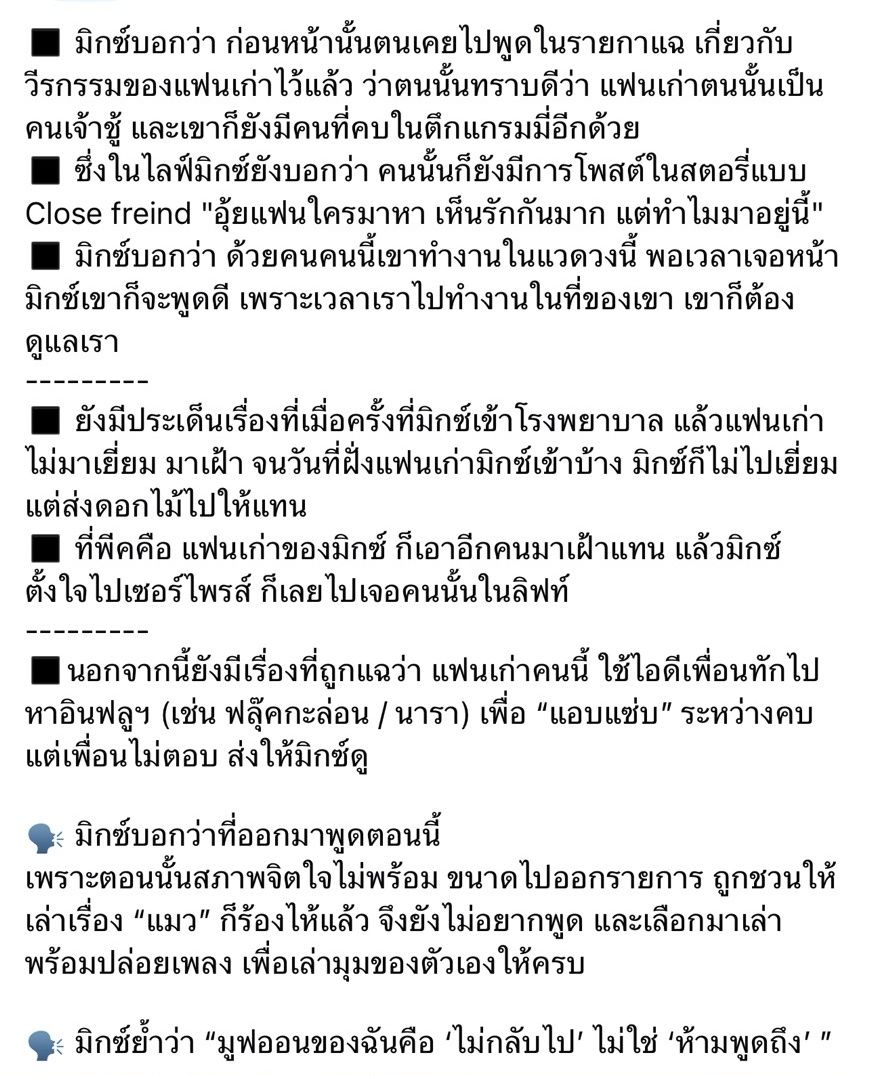 - มิกซ์บอกว่า ก่อนหน้านั้นตนเคยไปพูดในรายการแฉ เกี่ยวกับวีรกรรมของแฟนเก่าไว้แล้ว ว่าตนนั้นทราบดีว่า แฟนเก่าตนนั้นเป็นคนเจ้าชู้ และเขาก็ยังมีคนที่คบในตึกแกรมมี่อีกด้วย