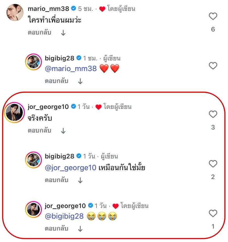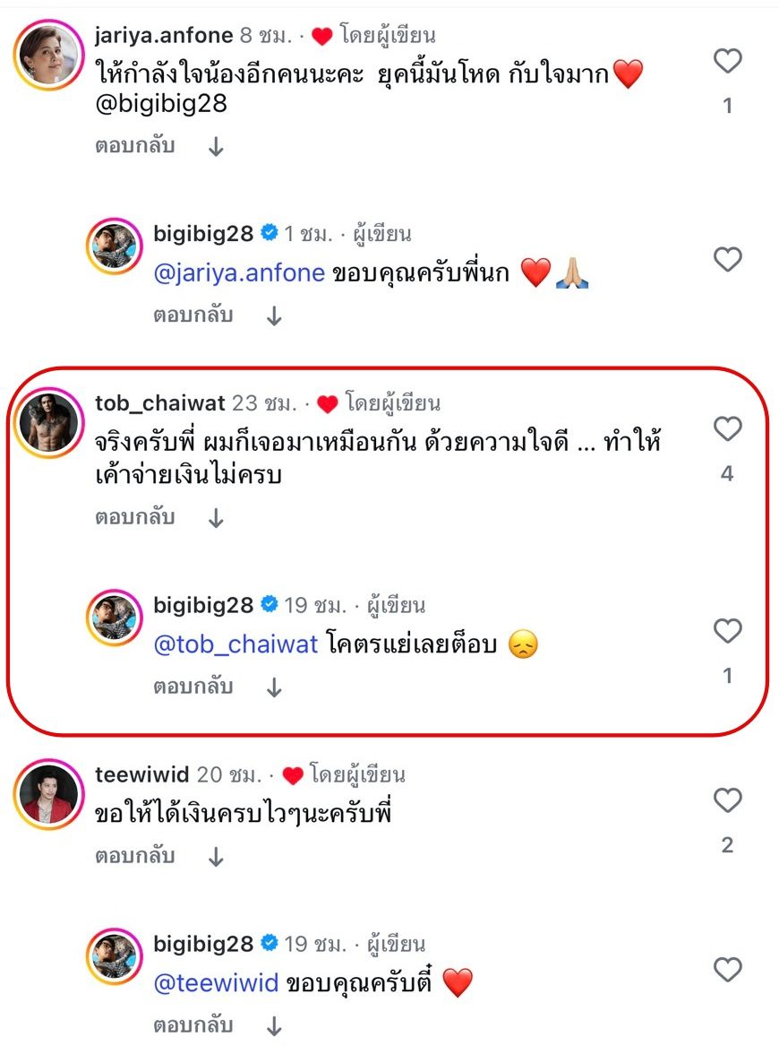 งานนี้มีทั้งคนในวงการบันเทิงและแฟนๆ มาส่งกำลังใจ ด้านนักแสดงหนุ่ม ต๊อบ ชัยวัฒน์ ทองแสง ก็คอมเมนต์บอกว่าเจอเหมือนกัน โดยบอกว่า “จริงครับพี่ ผมก็เจอมาเหมือนกัน ด้วยความใจดี … ทำให้เค้าจ่ายเงินไม่ครบ” และบิ๊กตอบกลับว่า “โคตรแย่เลยต็อบ” ในขณะที่นักแสดงหนุ่ม จอร์จ ฐปนัท สัตยานุรักษ์ ก็บอกว่า “จริงครับ” ก่อนที่บิ๊กจะถามกลับว่า “เหมือนกันใช่มั้ย” ซึ่งจอร์จก็ตอบกลับเป็นอีโมจิร้องไห้ด้วย