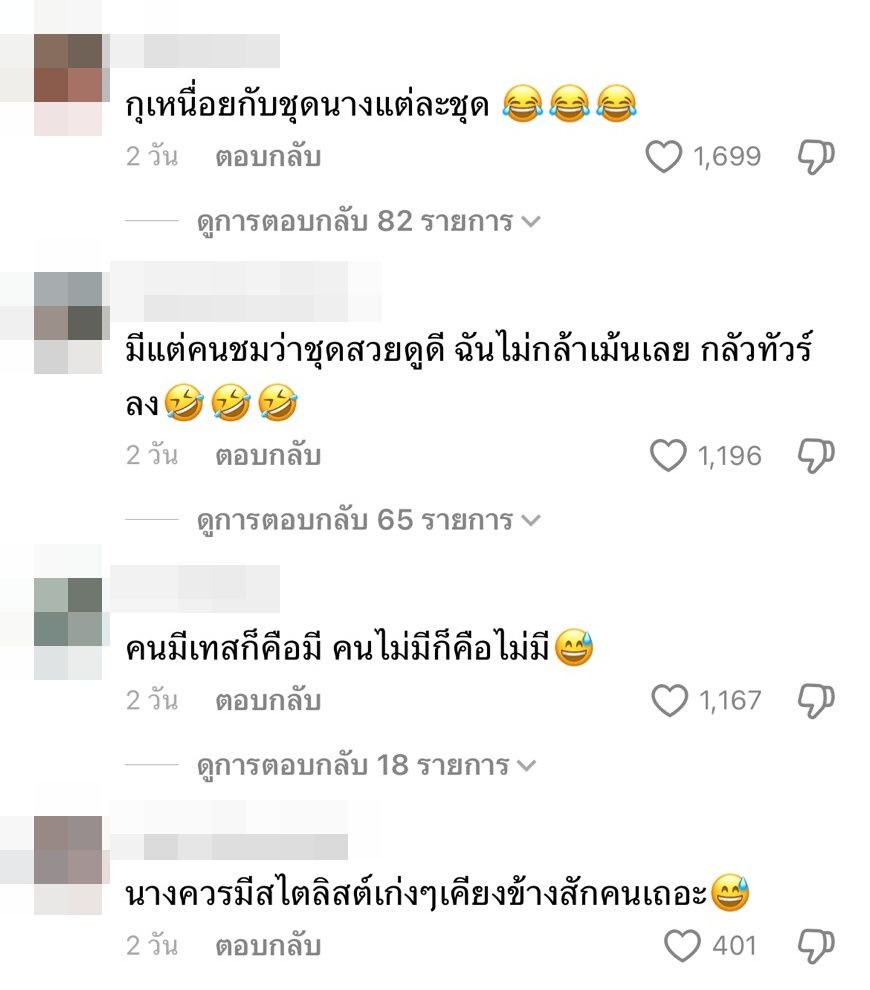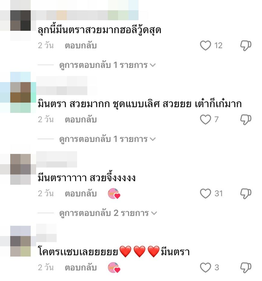 เทสฉัน ไม่เคยไปถึงเทสมีนตราซักที, กุเหนื่อยกับชุดนางแต่ละชุด, มีแต่คนชมว่าชุดสวยดูดี ฉันไม่กล้าเม้นเลย กลัวทัวร์ลง, คนมีเทสก็คือมี คนไม่มีก็คือไม่มี, นางควรมีสไตลิสต์เก่งๆเคียงข้างสักคนเถอะ, สวยค่ะ แต่ถ้าชุดข้างในเป็นมินิเดรสรัดรูปสีดำจะดูสวยกว่านี้, ยกทรงควรเป็นสีดำไหม มันจะได้เข้าทั้ง กกน. ใครคือคอสตูมนาง, มีนตราคือชุดอะไร, ทำไมหน้าไม่เหมือนมีนตราเลยอะ จำไม่ได้ แต่การแต่งตัวคือนาง, ควรจะหาคนดูแลเรื่องชุด จะดูมืออาชีพ เป็นต้น