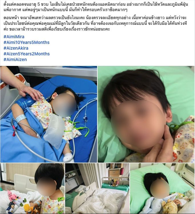 ตั้งแต่คลอดจนอายุ 5 ขวบ ไอเซ็นไม่เคยป่วยหนักจนต้องแอดมิดมาก่อน อย่างมากก็เป็นไข้หวัดและภูมิแพ้ฝุ่น แพ้อากาศ แต่พอจู่ๆ มาเป็นหนักแบบนี้ มันก็ทำให้ครอบครัวเราช็อกมากๆ