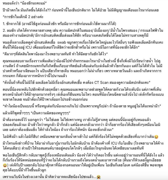 “การชักในเด็กมี 2 อย่างค่ะ 1. ชักจากไข้ (อาจมีไข้สูงก่อนแล้วชัก หรือมีอาการชักก่อนแล้วไข้ตามมาก็ได้) 2. ลมชัก เกิดได้จากหลายสาเหตุ เช่น ความผิดปกติในสมอง/ มีเนื้องอก/ มีน้ำในโพรงสมอง / กระแสไฟฟ้าในสมองทำงานผิดปกติ/ มีการอักเสบติดเชื้อส่งผลให้ชัก หรือบางเคสเกิดขึ้นได้โดยไม่ทราบสาเหตุก็มี หมอสั่งเจาะเลือดดูค่าอักเสบติดเชื้อ swab จมูกตรวจเรื่องไข้หวัดใหญ่และไวรัสอื่นๆ รอฟังผลเลือดอีกทีนะคะ คืนนี้ให้น้องอยู่ ICU เพื่อมอนิเตอร์ใกล้ชิดว่าจะชักซ้ำหรือไม่ เพราะมีโอกาสที่น้องจะชักได้อีก”