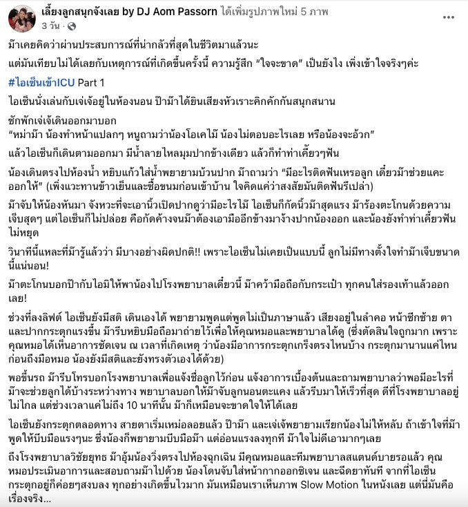 ซึ่งในแฟนเพจ เลี้ยงลูกสนุกจังเลย by DJ Aom Passorn ได้โพสต์ภาพของน้องไอเซ็นพร้อมทั้งเขียนข้อความเล่าถึงเรื่องนี้ว่า “ม๊าเคยคิดว่าผ่านประสบการณ์ที่น่ากลัวที่สุดในชีวิตมาแล้วนะ แต่มันเทียบไม่ได้เลยกับเหตุการณ์ที่เกิดขึ้นครั้งนี้ ความรู้สึก “ใจจะขาด” เป็นยังไง เพิ่งเข้าใจจริงๆ ค่ะ
