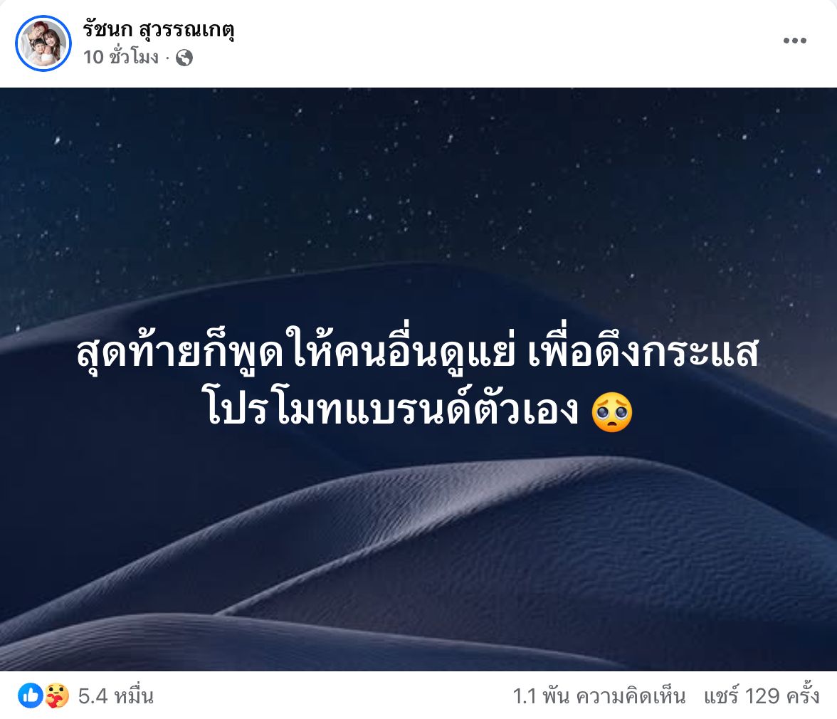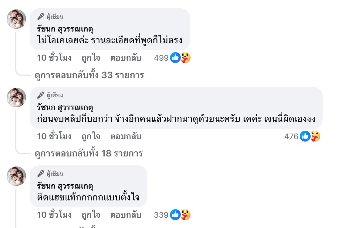 โดยเจนนี่ตัดพ้อเอาไว้ว่า "สุดท้ายก็พูดให้คนอื่นดูแย่ เพื่อดึงกระแสโปรโมทแบรนด์ตัวเอง" พร้อมใส่อีโมจิน้ำตาคลอ และนอกจากนี้ เจนนี่ยังได้คอมเมนต์ใต้โพสต์ต่ออีกว่า "ติดแฮชแท้กกกกกแบบตั้งใจ, ก่อนจบคลิปก็บอกว่า จ้างอีกคนแล้วฝากมาดูด้วยนะครับ เคค่ะ เจนนี่ผิดเองงง, ไม่โอเคเลยค่ะ รายละเอึยดที่พูดก็ไม่ตรง"