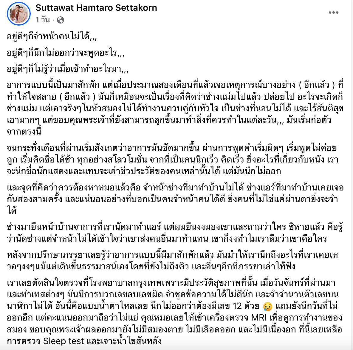 เราเลยตัดสินใจตรวจที่โรงพยาบาลกรุงเทพเพราะมีประวัติสุขภาพที่นั้น เมื่อวันจันทร์ที่ผ่านมาและทำเทสต์ต่างๆ มันมีการบวกเลขลบเลขผิด จำชุดข้อความได้ไม่ดีนัก และจำจำนวนตัวเลขบนนาฬิกาไม่ได้ อันนี้คือแบบน้ำตาไหลเลย นึกไม่ออกว่าต้องมีเลข 12 ด้วย แถมยังนึกวันที่ไม่ออกอีก แต่คะแนนออกมาถือว่าไม่แย่ คุณหมอเลยให้เข้าเครื่องตรวจ MRI เพื่อดูการทำงานของสมอง ขอบคุณพระเจ้าผลออกมายังไม่มีสมองตาย ไม่มีเลือดออก และไม่มีเนื้องอก ที่นี้เลยเหลือการตรวจ Sleep test และเจาะน้ำไขสันหลัง