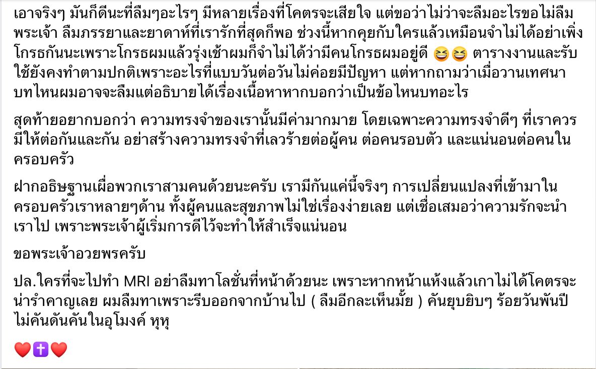 เอาจริงๆ มันก็ดีนะที่ลืมๆ อะไรๆ มีหลายเรื่องที่โคตรจะเสียใจ แต่ขอว่าไม่ว่าจะลืมอะไรขอไม่ลืมพระเจ้า ลืมภรรยาและยาดาห์ที่เรารักที่สุดก็พอ ช่วงนี้หากคุยกับใครแล้วเหมือนจำไม่ได้อย่าเพิ่งโกรธกันนะเพราะโกรธผมแล้วรุ่งเช้าผมก็จำไม่ได้ว่ามีคนโกรธผมอยู่ดี