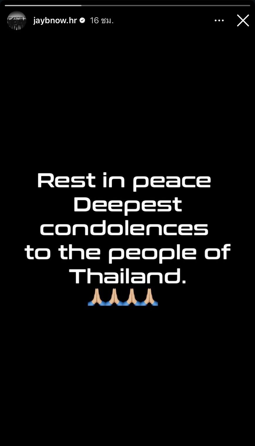 โดยในอินสตาแกรมสตอรี่ @jaybnow.hr ได้โพสต์ข้อความเป็นภาษาอังกฤษ ระบุว่า “Rest in peace Deepest condolences to the people of Thailand” (เสด็จสู่สวรรคาลัย ขอแสดงความเสียใจอย่างสุดซึ้งต่อประชาชนชาวไทย)