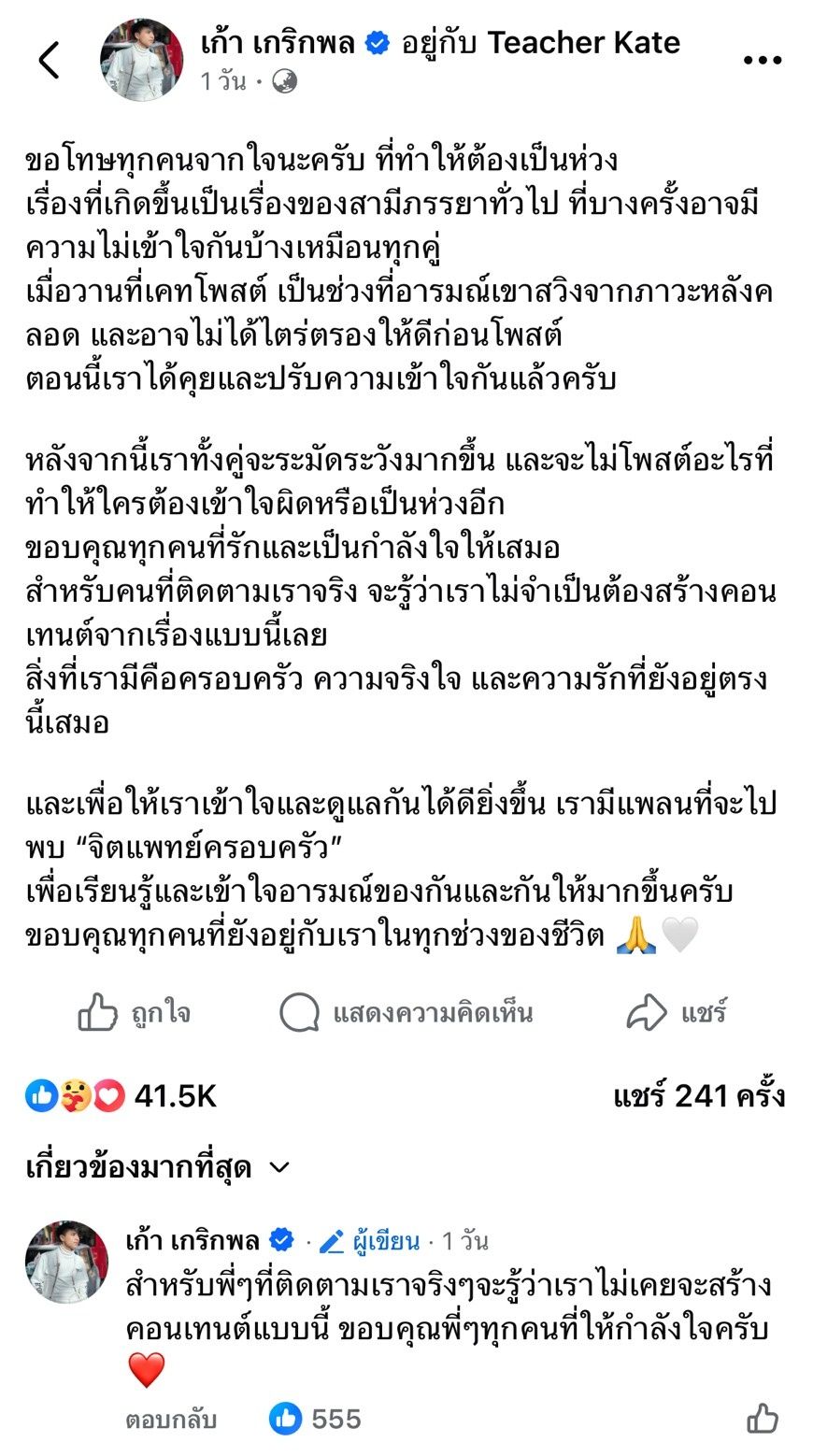 "ขอโทษทุกคนจากใจนะครับ ที่ทำให้ต้องเป็นห่วง เรื่องที่เกิดขึ้นเป็นเรื่องของสามีภรรยาทั่วไป ที่บางครั้งอาจมีความไม่เข้าใจกันบ้างเหมือนทุกคู่ เมื่อวานที่เคทโพสต์ เป็นช่วงที่อารมณ์เขาสวิงจากภาวะหลังคลอด และอาจไม่ได้ไตร่ตรองให้ดีก่อนโพสต์ ตอนนี้เราได้คุยและปรับความเข้าใจกันแล้วครับ