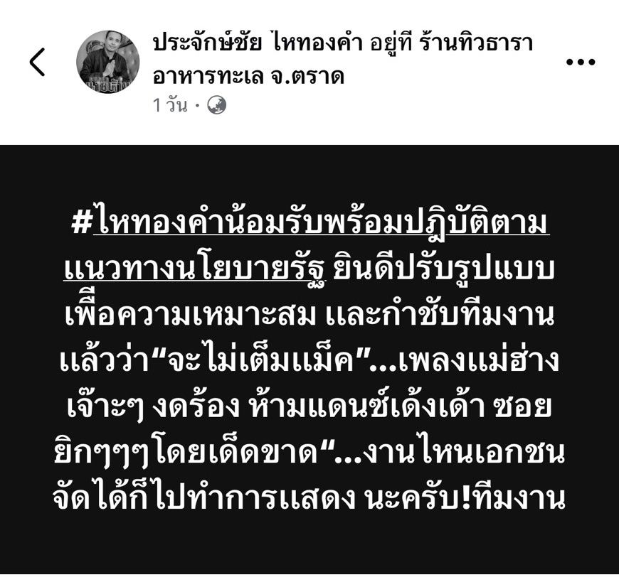 ก่อนจะโพสต์ใหม่เพิ่มเติมว่า "#ไหทองคำน้อมรับพร้อมปฏิบัติตามแนวทางนโยบายรัฐ ยินดีปรับรูปแบบเพื่อความเหมาะสม และกำชับทีมงานแล้วว่า “จะไม่เต็มแม็ก”…เพลงแม่ฮ้าง เจ๊าะๆ งดร้อง ห้ามแดนซ์เด้งเด้า ซอยยิกๆๆๆโดยเด็ดขาด“…งานไหนเอกชนจัดได้ก็ไปทำการแสดง นะครับ!ทีมงาน"