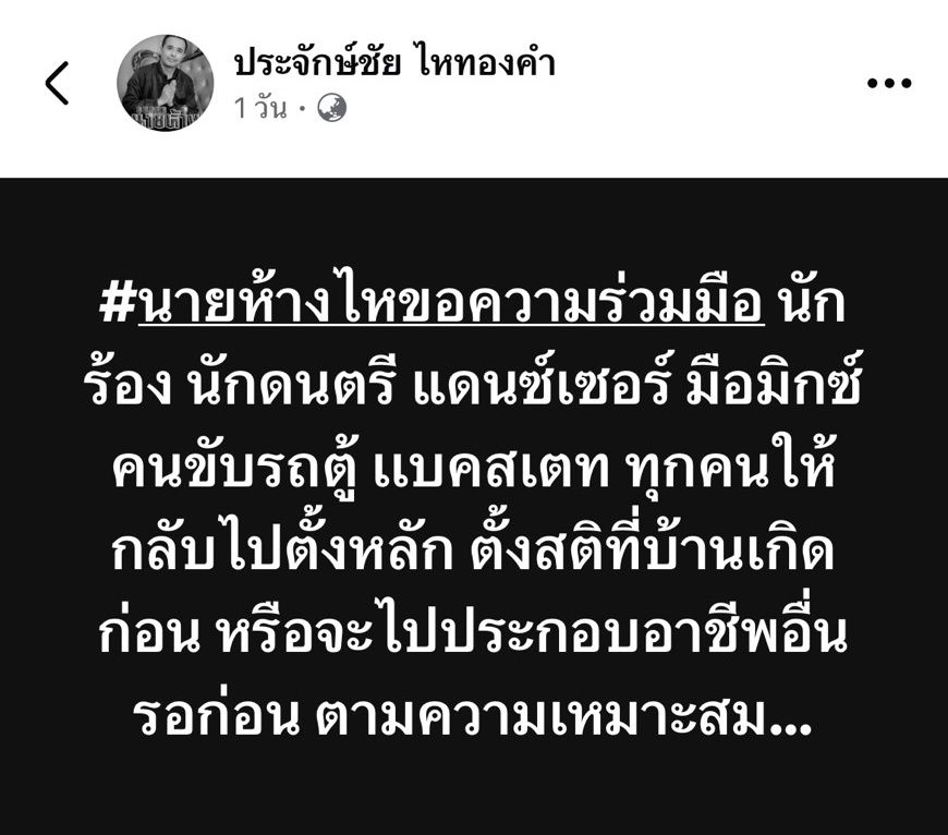"#นายห้างไหขอความร่วมมือ นักร้อง นักดนตรี แดนซ์เซอร์ มือมิกซ์ คนขับรถตู้ แบ็กสเตจ ทุกคนให้กลับไปตั้งหลัก ตั้งสติที่บ้านเกิดก่อน หรือจะไปประกอบอาชีพอื่นรอก่อน ตามความเหมาะสม…"