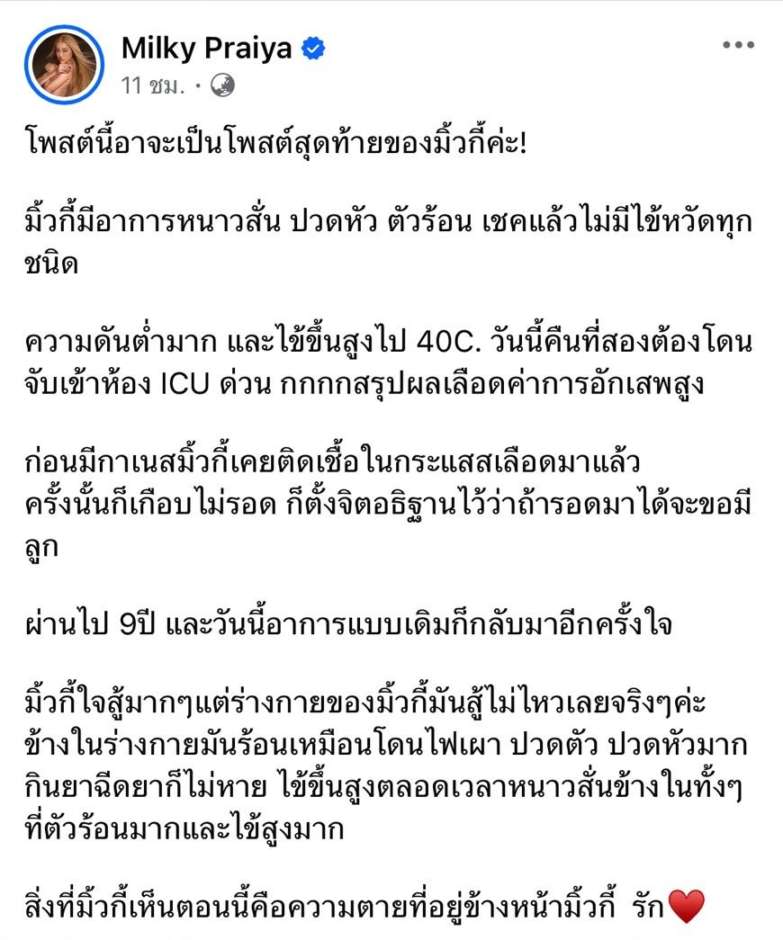 "โพสต์นี้อาจจะเป็นโพสต์สุดท้ายของมิ้วกี้ค่ะ! มิ้วกี้มีอาการหนาวสั่น ปวดหัว ตัวร้อน เช็กแล้วไม่มีไข้หวัดทุกชนิด ความดันต่ำมาก และไข้ขึ้นสูงไป 40C. วันนี้คืนที่สองต้องโดนจับเข้าห้อง ICU ด่วน สรุปผลเลือดค่าการอักเสบสูง