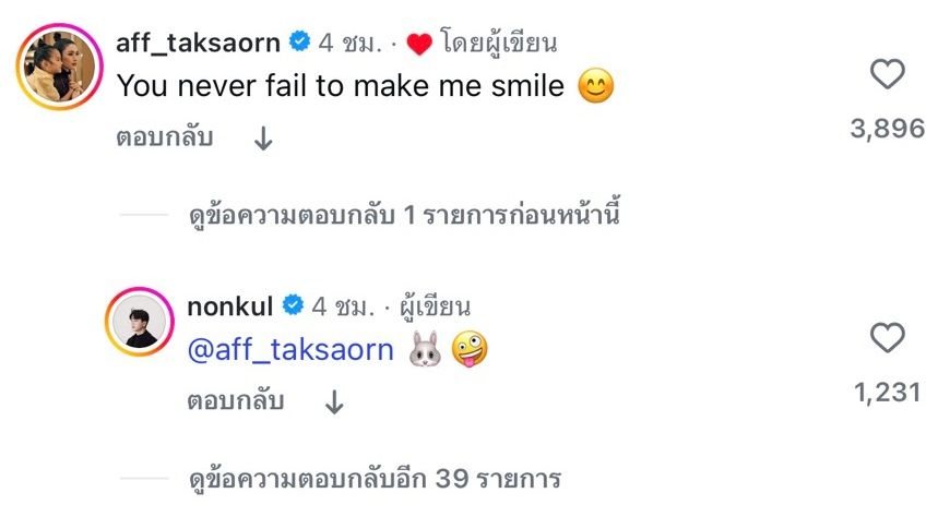 ด้านเจ้าของวันเกิดอย่างแอฟก็คอมเมนต์ตอบกลับสุดหวานไว้ว่า “You never fail to make me smile” (เธอทำให้ฉันยิ้มได้เสมอ) และนนกุลก็ตอบกลับเป็นอีโมจิกระต่ายและแลบลิ้น
