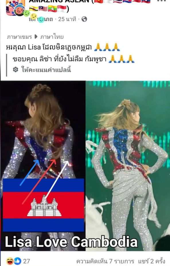 ซึ่งหลังจากที่โชว์นี้ได้ถูกเผยแพร่ในโซเชียล ก็ได้มีคนกัมพูชา เอาภาพของลิซ่าในชุดดังกล่าวมาโพสต์ข้อความเป็นภาษากัมพูชา ที่แปลเป็นไทยว่า "ขอบคุณลิซ่าที่ยังไม่ลืมกัมพูชา"