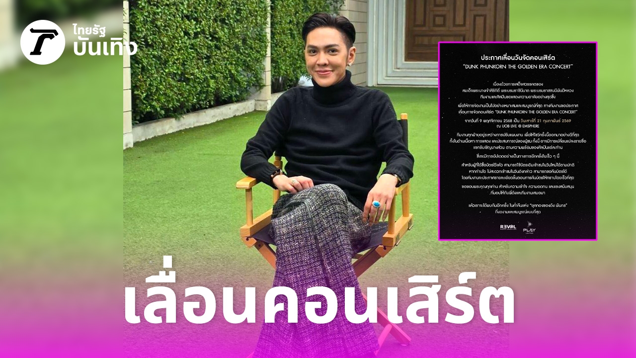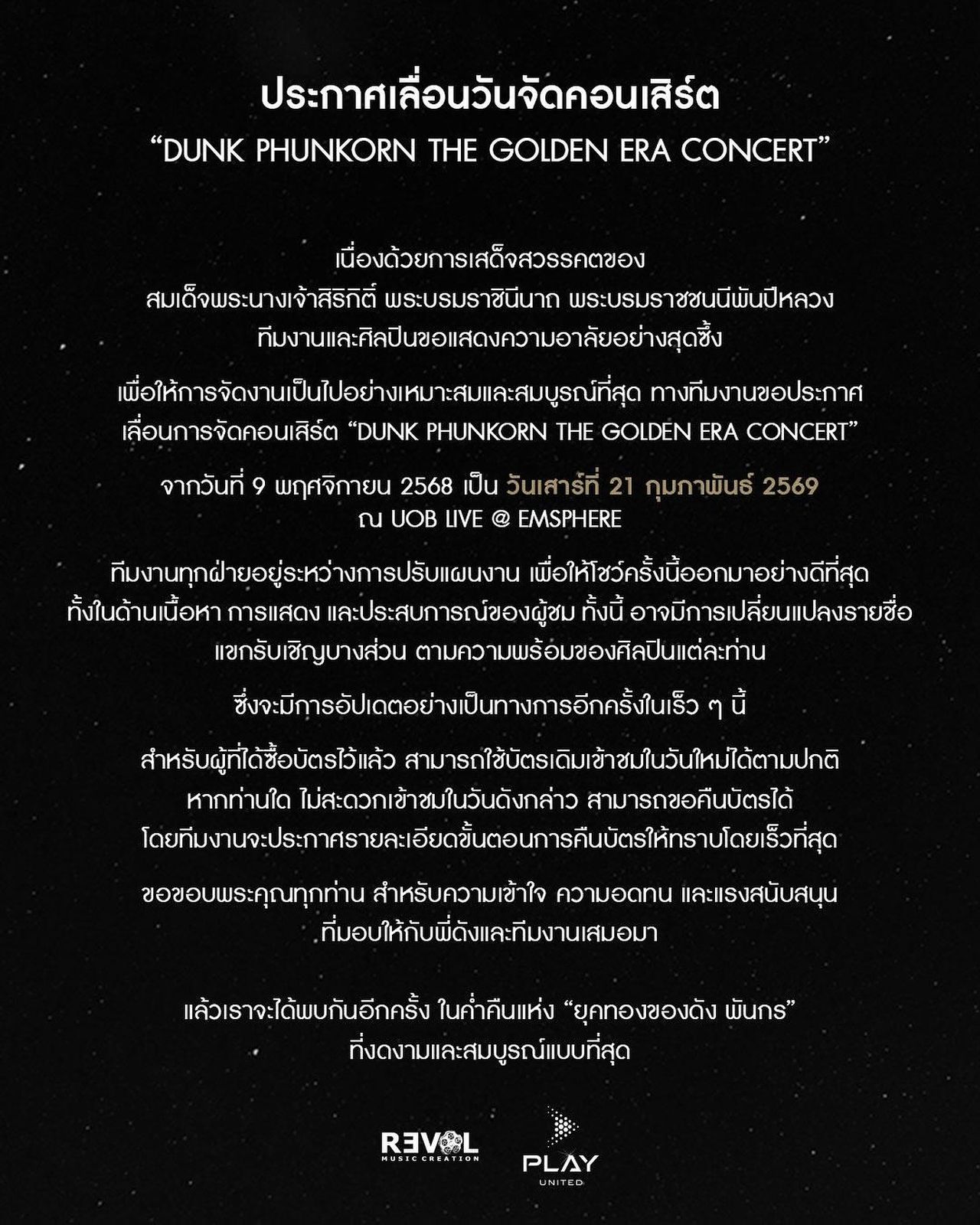 เพื่อให้การจัดงานเป็นไปอย่างเหมาะสมและสมบูรณ์ที่สุด ทางทีมงานขอประกาศเลื่อนการจัดคอนเสิร์ต “DUNK PHUNKORN THE GOLDEN ERA CONCERT” จากวันที่ 9 พฤศจิกายน 2568 เป็นวันเสาร์ที่ 21 กุมภาพันธ์ 2569 ณ UOB LIVE @ EmSphere