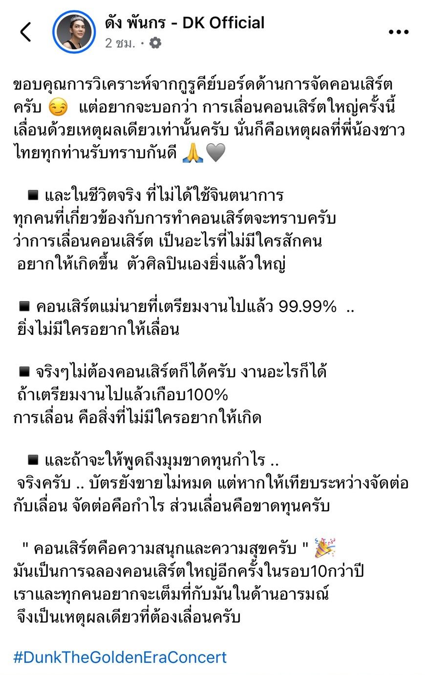 "คอนเสิร์ตคือความสนุกและความสุขครับ" มันเป็นการฉลองคอนเสิร์ตใหญ่อีกครั้งในรอบ 10 กว่าปี เราและทุกคนอยากจะเต็มที่กับมันในด้านอารมณ์ จึงเป็นเหตุผลเดียวที่ต้องเลื่อนครับ #DunkTheGoldenEraConcert"